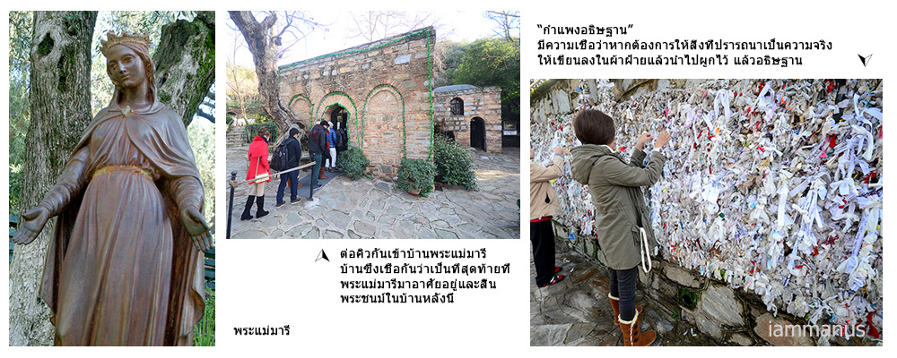 โปรแกรมเช้านี้ออกจากที่พักนั่งรถไปสัก 45 นาทีก็ถึงล่ะ บ้านพระแม่มารี (House of Virgin Mary) เชื่อกันว่าเป็นที่สุดท้ายที่พระแม่มารีมาอาศัยอยู่และสิ้นพระชนม์ในบ้านหลังนี้ ถูกค้นพบอย่างปาฏิหารย์ โดยแม่ชีตาบอด ชาวเยอรมันชื่อ แอนนา แคเทอรีน เอมเมอริช (Anna Catherine Emmerich, ค.ศ. 1774-1824) ได้เขียนบรรยายสถานที่ไว้ในหนังสืออย่างละเอียดราวกับเห็นด้วยตาตนเอง เมื่อเธอเสียชีวิตลง มีคนพยายามสืบเสาะค้นหาบ้านหลังนี้ จนพบในปี ค.ศ. 1891 ปัจจุบันบ้านพระแม่มารีได้รับการบูรณะเป็นบ้านอิฐชั้นเดียว ภายในมีรูปปั้นของพระแม่มารี ซึ่ง พระสันตปาปา โป๊ป เบเนดิกส์ที่ 16 ได้เคยเสด็จเยือนที่นี่ บริเวณด้านนอกของบ้าน มีก๊อกน้ำสามก๊อกที่เชื่อว่าเป็นก๊อกน้ำที่มีความศักดิ์สิทธิ์ แทนความเชื่อในเรื่อง สุขภาพ ความร่ำรวย และความรัก ถัดจากก๊อกน้ำเป็น กำแพงอธิษฐาน ซึ่งมีความเชื่อว่าหากต้องการให้สิ่งที่ปรารถนาเป็นความจริงให้เขียนลงในผ้าฝ้ายแล้วนำไปผูกไว้แล้วอธิษฐาน [ลอกมาจากโปรแกรมทัวร์ – ตอนไปก็ไม่ได้อ่านไปก่อน เพิ่งรู้ตอนมาเขียนนี่แหละ 55]