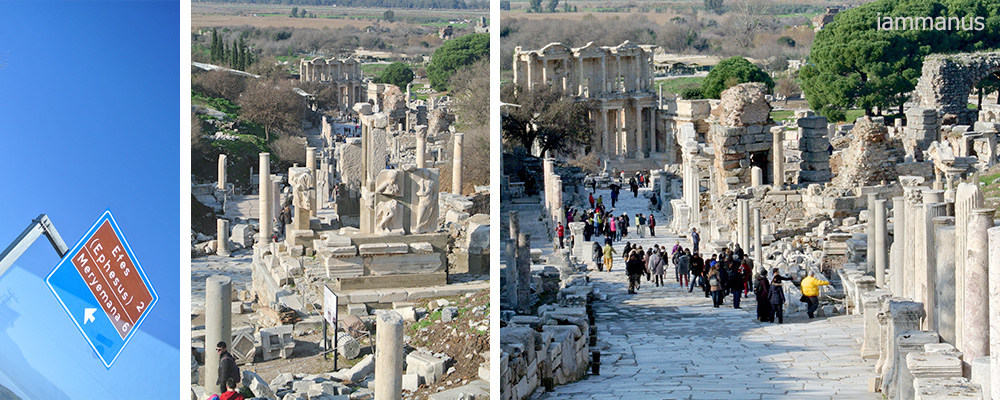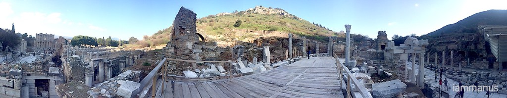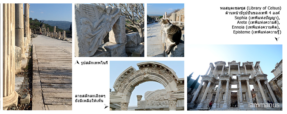 ไม่รู้จะเล่ายังไง เพราะมันมีจุดสนใจตามรายทางมาเรื่อยๆ มีรูปปั้นโน่นนี่นั่น มีส้วมโบราณ มีพื้นโมเสคโบราณ อ่อจำได้อันนึงเทพไนกี้ ฮาๆนะ มันมีที่มาจริงๆแฮะ… มีรูปปั้นเมดูซ่า (Medusa) นึกถึง Versace เลยนะ ก็เดินไปจนถึงไฮไลต์คือห้องสมุด ที่มีผนังด้านหน้าหอสมุดหลงเหลือให้เห็นได้ใหญ่โตอยู่ เป็นภาพไฮไลต์ของที่นี่กันเลยทีเดียว