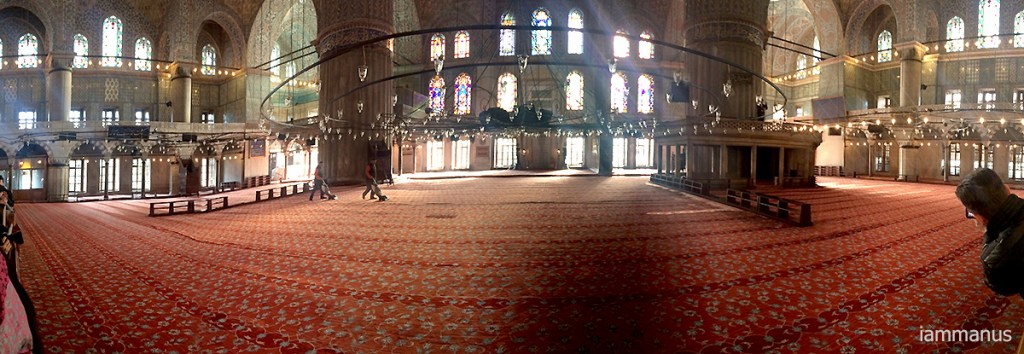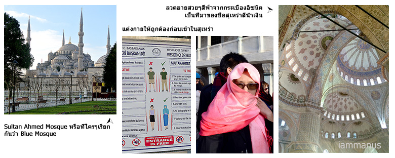 จากนั้นก็เดินเข้าด้านข้างของสุเหร่าสีน้ำเงิน รับผ้าโพกหัวคนละผืนฟรี ยืมแล้วคืนขาออก ถ้าใครเตรียมของตัวเองมาก็ดี ไม่รู้ผ้าโพกหัวใครมาบ้าง อันนี้บังคับผู้หญิงต้องโพกทุกคน แล้วก็ต่อแถวกันเข้าชมด้านใน ก่อนเข้าถอดรองเท้าด้วย ใส่ถุงหิ้วไป ผู้คนมากมายล้นหลามแม้พวกเราจะมากันแต่เช้าก็ตาม สุเหร่าสีน้ำเงินนี้ เค้าว่ากันว่า เมห์เมต อาอา (Mehmet Ağa) สถาปนิกผู้สร้าง ต้องการแสดงให้โลกรู้ว่าเขามีความสามารถเหนืออาจารย์ ที่เป็นสถาปนิกที่ออกแบบวิหารเซนต์โซเฟีย เลยออกแบบซะงาม แล้วสร้างประจันหน้ากันซะเลย เข้าไปดูด้านในสวยงามตามท้องเรื่องเลย ถ่ายรูปลำบากเหลือเกิน ด้วยว่าคนเยอะ เวลาน้อย ที่แคบ บันทึกในความทรงจำมาละกัน
