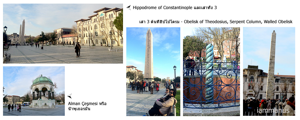 แต่มีที่น่าสนใจดูคือ เสา 3 ต้น คือ Obelisk of Theodosius – เสาโอเบลิกส์ที่สร้างในอียิปต์ เพื่อถวายแก่ฟาโรห์ตุตโมซิสที่ 3 เป็นแท่งเด่นสง่าอยู่กลางลานเหมือนที่อิยิปต์เป๊ะ เสาต้นที่สองคือ Serpent Column หรือเสางู เป็นเกลียวๆแต่หักเหลือโคนๆอยู่หน่อยนึงล้อมรั้วไว้ ช่วยชะโงกดูด้วย และเสาต้นที่สาม Walled Obelisk – เสาคอนสแตนตินที่ 7 เหมือนเอาหินมาก่อๆเรียงกัน texture สวยดี