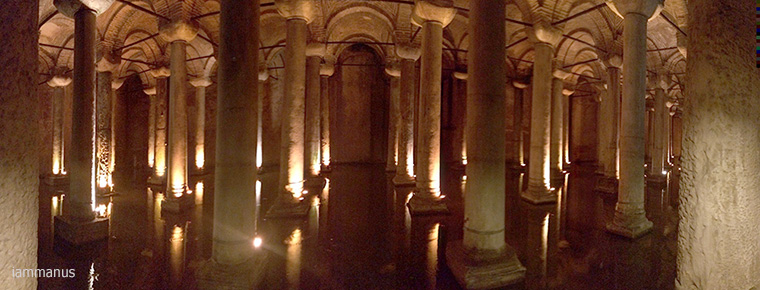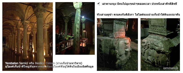 ออกจากเซนต์โซเฟียแล้วเราเดินข้ามถนนไปต่อคิวใหม่เพื่อเข้า อ่างเก็บน้ำใต้ดินเยเรบาตัน (Yerebatan Sarnici) ต้องเดินลงบันไดไปใต้ดิน ทางจะเปียกๆชื้นๆหน่อยนะ ดูแลสว.ดีๆหน่อย ระวังลื่น ลงไปด้านล่างแล้วมันจะมืดๆถ่ายรูปยากมากนะเพราะมันมืด shutter speed ต่ำมาก นักท่องเที่ยวก็เยอะเดินกันตลอดสรุปว่าตั้งกล้องถ่ายไม่ได้ ก็เลยต้องควักไอโฟนมาถ่าย เก็บบรรยากาศพอได้