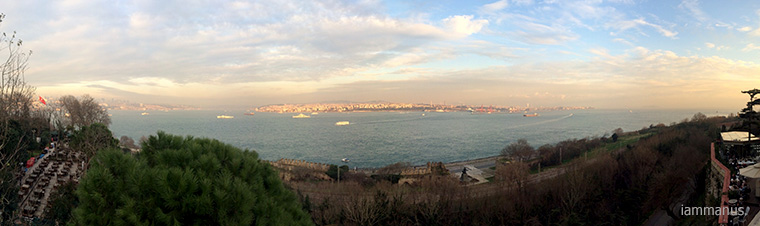 ถ้ามีเวลาให้เดินเลยไปด้านหลัง จะมีระเบียงกว้างใหญ่ที่ชมวิว ทะเลมาร์มาร่า (Sea of Marmara) ได้ แถมมองเห็น 2 ฝั่งทวีปเลยคือฝั่งเอเชียและฝั่งยุโรป ที่เราอยู่นี่คือฝั่งเอเชียนะ เห็นช่องแคบบอสฟอรัสได้ด้วย เสียดายว่าวันนี้อากาศไม่ดีเลย ฟ้าหลัวมัวซัวทั้งวัน ภาพเลยออกมาหม่นหมอง แถมเลนส์พังอีก เศร้าใจ ได้แต่งัดไอโฟนออกมาถ่ายแทน อีกวันเดียวเอง จะรีบพังไปไหน