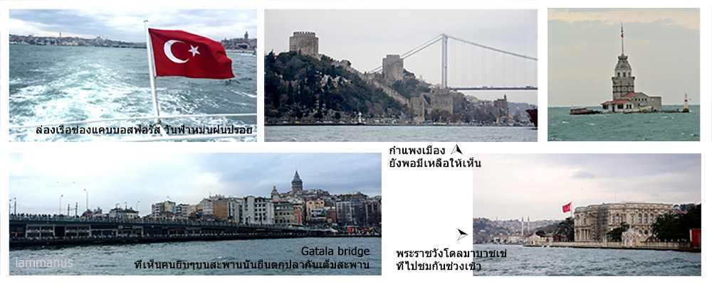 หลังอาหารเที่ยงอันจืดชืดและน่าเบื่อ แต่เป็นเที่ยงสุดท้ายในตุรกี พวกเราก็ไปลงเรือกัน เราจะล่องช่องแคบบอสฟอรัส ช่องแคบนี้เชื่อมทะเลดำ (The Black sea) กับทะเลมาร์มาร่า (Sea of Marmara) มีความยาวประมาณ 32 กม. ถ้าอากาศดีๆน่าจะสวยงาม นั่งชมวิวทิวทัศน์บ้านเรือนฝั่งยุโรป ฝั่งเอเชีย แต่วันนี้อากาศมัวซัว หนาวเหน็บ เลยไม่ค่อยชิลเท่าไหร่ สู้ลมหนาวถ่ายรูปเป็นพักๆก็ต้องกลับมาแอบในเคบินอุ่นๆ เรือจะล่องผ่าน วังโดลมาบาชเช่ที่เราเที่ยวเมื่อเช้าด้วย