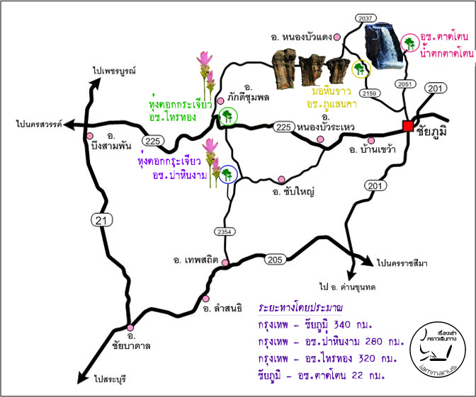 แผนการคร่าวๆคือ ออกเดินทางจากกรุงเทพฯตอนเช้า พุ่งตรงไปตัวเมืองชัยภูมิ เพื่อทานขนมจีน แล้วไปเที่ยว ‘มอหินขาว’ กับ ‘น้ำตกตาดโตน’ แล้วไปพักแถวๆอ.เทพสถิตย์ ค่อยเข้าดูดอกกระเจียวที่อช.ป่าหินงามช่วงเช้าวันรุ่งขึ้น ถ้ามีเวลาสัก 2 คืน ก็ไปดูดอกกระเจียวที่ไทรทองก่อน แล้วค่อยลงมาที่ป่าหินงาม แล้วกลับกรุงเทพฯได้เลย ทีเดียวเที่ยวครบ