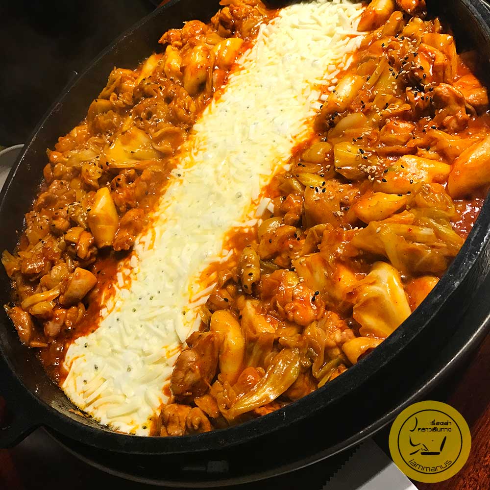 ทัคคัลบี้ร้านที่เจอ จำชื่อไม่ได้ เพราะร้านที่ตั้งใจไปตามพิกัดที่เพื่อนบอกมาหาไม่เจอ มาเจอร้านนี้กินเลย Dak Galbi | 닭갈비 | ทัคคัลบี้ คือไก่ผัดซอสแบบเกาหลี ปกติจะมาแบบกระทะร้อน คราวนี้สั่งแบบใส่ชีสมาด้วย พอคลุกแล้วมันก็จะยืดแบบในรูปก็อร่อยดีนะ ความจริงเจอร้านไหนก็กินได้แหละ เล็งร้านคนเยอะๆไว้ อร่อยหมดแหละ