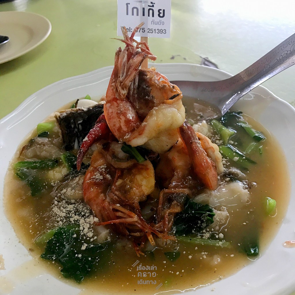มาถึงกันตัง ก็ต้องมาชิมร้านดังของอำเภอที่ร้าน โกเกี้ย อยู่กลางเมืองกันตังนั่นแหละ เมนูโด่งดังก็ต้องเป็นอาหารทะเล ที่ กุ้ง ปู ปลา ตัวโตๆ จานเด็ดคือ ราดหน้าทะเลรวม มาร้านนี้ต้องใจเย็นๆ เพราะคนก็เยอะ ทำก็นานเพราะทำทีละจาน ว่ากันว่าอย่าทวงถาม สั่งแล้วก็นั่งรอไป เรามาถึงบ่ายโมง คนยังเต็มร้าน สั่ง ราดหน้าทะเลรวม กับ กุ้งทอดซ็อสมะขาม รอไป 45 นาที แต่รสชาติก็คุ้มเวลารอแหละ แต่ถ้าใครมีเวลน้อย หรือต้องไปเที่ยวหลายที่ ไปหาอะไรกินง่ายๆเร็วๆดีกว่า