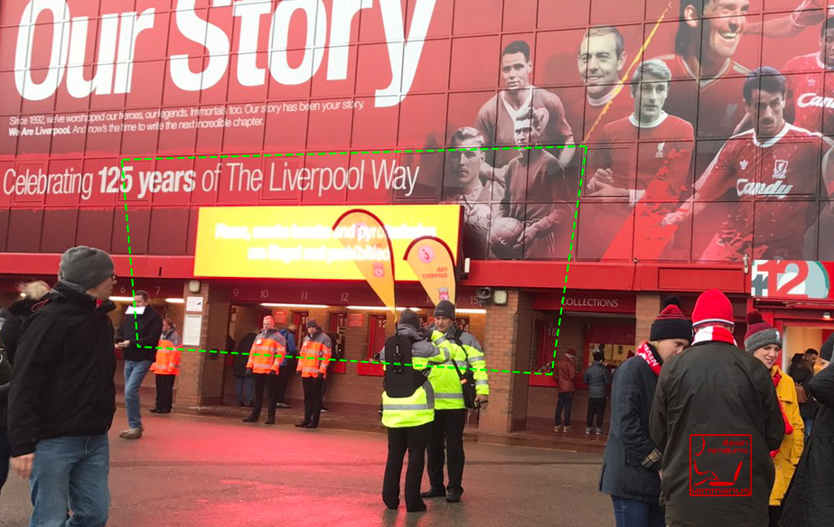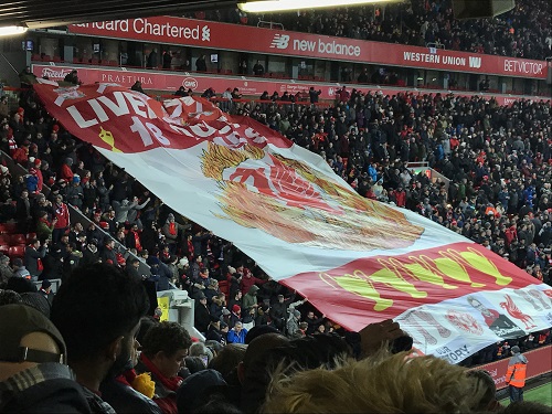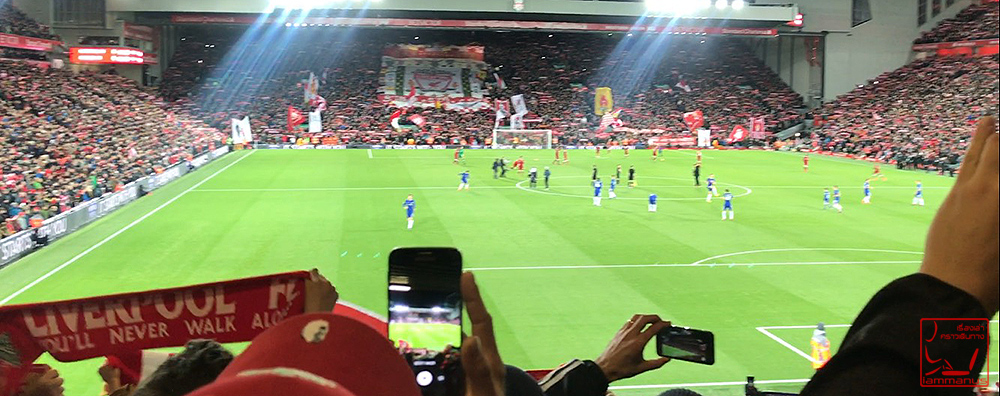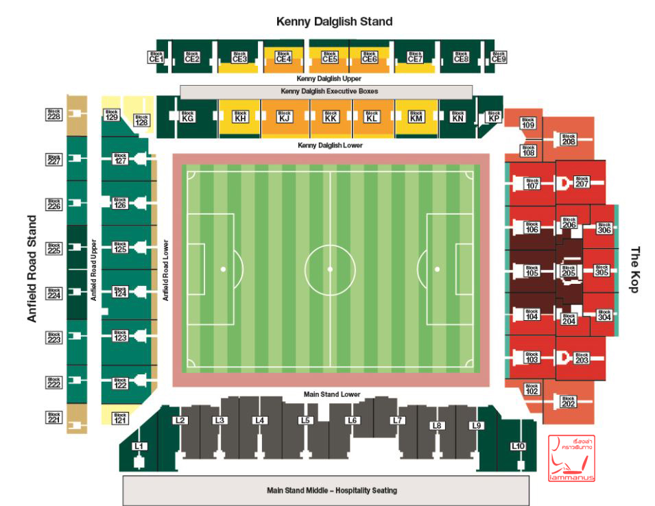 ฝั่ง main stand คือฝั่งที่นักฟุตบอลเดินออก, ฝั่ง The Kop คือฝั่ง The Kop ล้วนๆแบบฮาร์ดคอ เชียร์กระหึ่ม, ฝั่ง Anfield Rd. จะมีทีมเยือนนั่งอยู่ด้วยแต่แค่ 1 ล็อคเล็กๆเท่านั้น