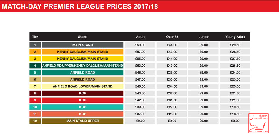 คุณเป็นแฟนทีมอะไร? เข้าไปในเวปไซต์อย่างเป็นทางการของทีมเลย คุณสามารถซื้อบัตรจากเวปไซต์ของทีมได้ โดยเข้าไปดูรายการการแข่งต่างๆที่มีขายได้ โดยสโมสรจะมีกำหนดวันเปิดขายบัตร 2 ช่วง คือ ช่วงก่อนเปิดฤดูกาล (กรกฏาคม) และก่อนถึงครึ่งฤดูกาลหลัง (พฤศจิกายน) ดังนั้นต้องเข้าไปเช็คในเวปไซต์ ก่อนล่วงหน้าแต่เนิ่นๆ ราคาตั๋วของผู้ใหญ่ (Adult)จะเป็นตามตาราง ขึ้นกับตำแหน่งที่นั่ง ดูเทียบกับแผนผังที่นั่งได้ http://www.liverpoolfc.com/tickets/match-day-premier-league-prices-2017-18