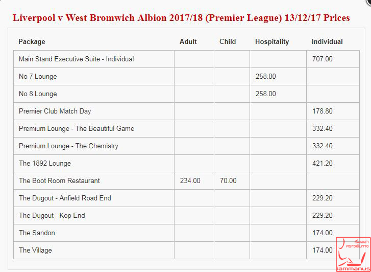 ถ้าคุณไม่ได้สมัครสมาชิก คุณก็ต้องรอซื้อตั๋วหลังจากสมาชิกด้านบนเลือกซื้อไปหมดแล้ว ยังมีที่เหลือแค่ไหน ถึงจะหลุดมาถึงให้คนทั่วไปซื้อได้ 1 คนซื้อได้ 4 ใบ แต่จากที่ดูๆมาบัตรปกติ มักจะไม่ค่อยเหลือหลุดมาถึงคนทั่วไป โดยเฉพาะนัดใหญ่ที่ผู้คนสนใจ ที่มีเหลือให้ซื้อ จะเป็นตั๋ว Package พิเศษ เช่น นั่งดูใน special lounge หรือพวกรวมที่พัก ซึ่งราคาก็ทะลุกไป 200£ – 300£ อันนี้ตัวอย่าง นัด Liverpool – West Bromwich Albion จะเห็นว่าวันนี้เหลือแต่บัตรราคา 3 หลักทั้งนั้น เป็นที่พิเศษบ้าง รวม meet & Greet บ้าง รวมที่พักบ้าง