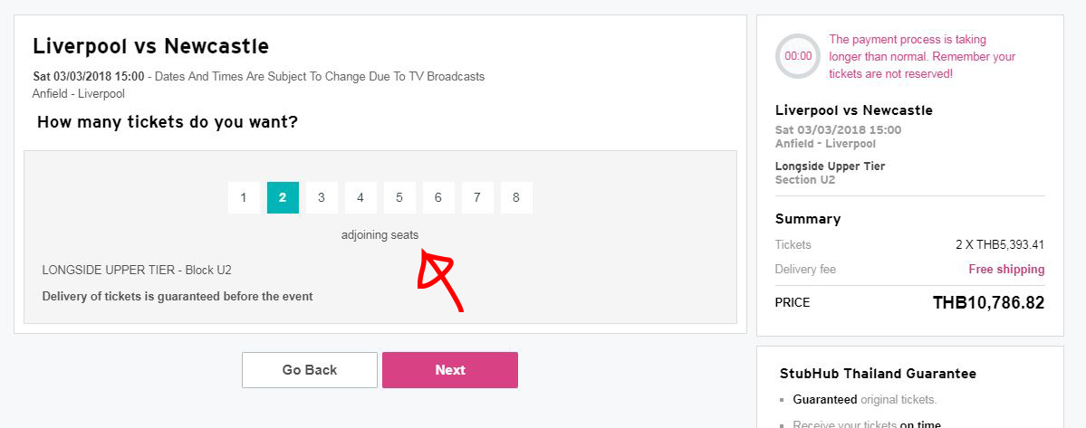 เมื่อกดเลือกไปแล้วจะเปลี่ยนมาเป็นหน้านี้ ถ้าคุณเลือกมากกว่า 1 ที่ มันจะมีขึ้นรายละเอียดมาให้ว่าที่ติดกัน หรือที่ใกล้ๆกัน อย่างในรูปคือ adjoining seats คือที่ใกล้ๆกัน ตอนเราซื้อ (Liv-Che) มันขึ้นว่าอะไรจำไม่ได้ น่าจะ beside หรืออะไรทำนองนี้ แต่ความหมายว่าที่ติดกัน แต่เอาจริงพอวันได้บัตรมันแค่ที่ใกล้กันห่างกัน 3 แถว ดีว่าแถวสูงกว่ามีคนนั่งคนเดียวเลยขอแลกกับเค้าให้ลงไปนั่งข้างล่างกว่า 3 แถว เค้าก็โอเค ตามจริงแล้วหาบัตรที่ติดกันคงยากหน่อยยิ่งมากกว่า 2 คนยิ่งยาก แต่ไปขอแลกก็พอได้ อย่างน้อยเลือกให้ได้ adjoining seats ไว้ก่อน