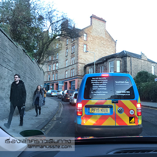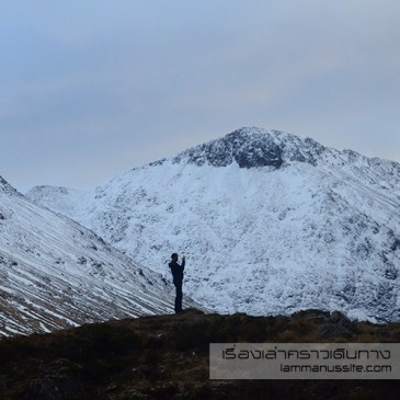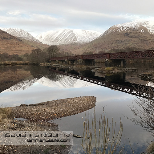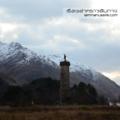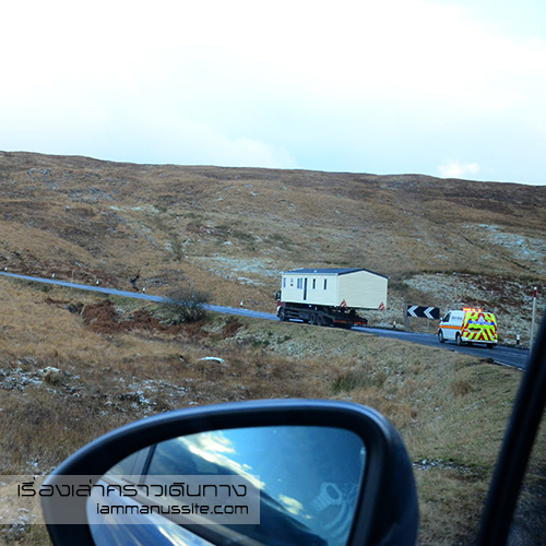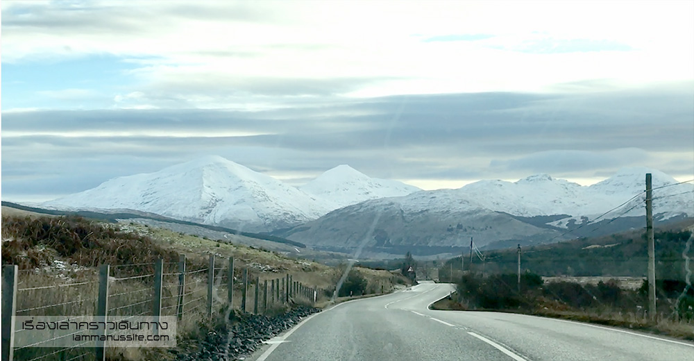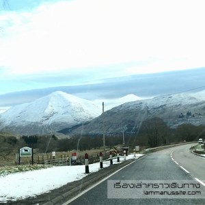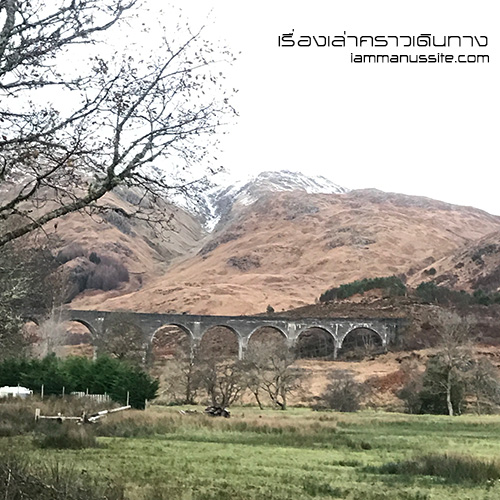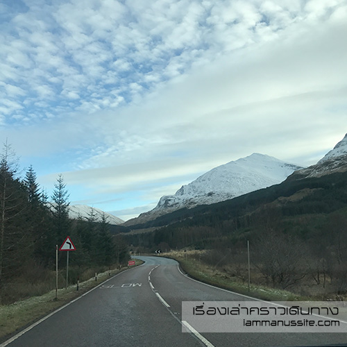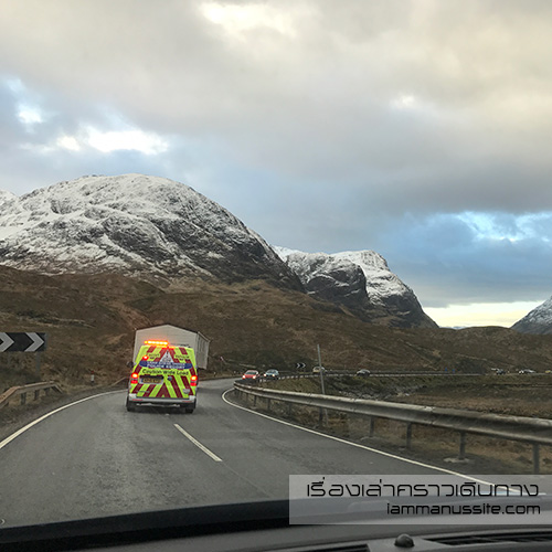 ขับกลับออกมาในตัวเมือง Doune แวะซื้อแซนวิสกับกาแฟ แล้วออกเดินทางต่อ เป้าหมายวันนี้ต้องไปเห็นทางรถไฟสายฮอกวอทต์ที่ Glenfinnan ทางไปต่อจากนี้ ผ่านหุบเขา Glencoe บรรยากาศสวยแบบซึมๆ แต่น่าจอดเดินเที่ยวจริงๆ เห็นมีรถจอดแล้วเดินเล่นผ่านทุ่งหญ้าฝ่าพื้นน้ำแข็งเข้าไปตามเชิงเขา แต่เราไม่มีเวลาต้องไปถึง Glenfinnan ก่อนแสงจะหมด ดวงไม่ดีอีกครั้ง เจอรถพ่วงย้ายบ้าน ใช่ ย้ายบ้าน คือยกบ้านทั้งหลังเลย ถนน 2 เลน แซงก็ไม่ได้ ขับตามกันไปเป็นชั่วโมง เสียเวลากับระยะทางไปพอสมควรเลย