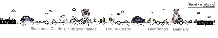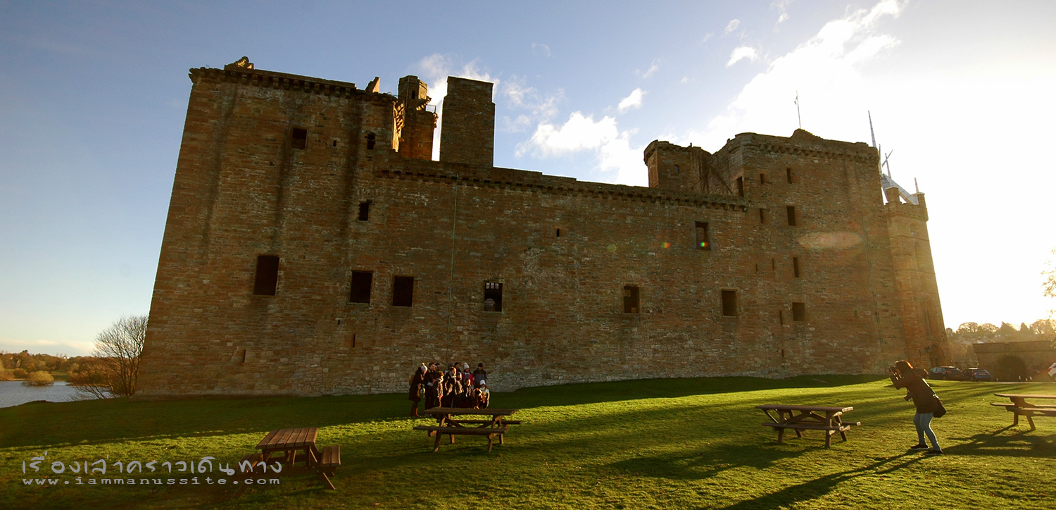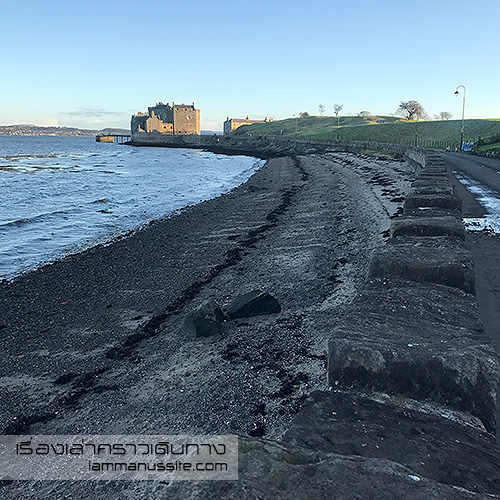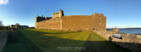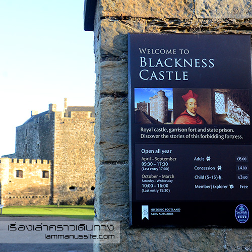ออกจากเอดินเบอระมาไม่นานก็กลายเป็นทิวทัศน์ชนบทแล้ว ทุ่งหญ้า ทุ่งนา เลี้ยววัว เลี้ยงแกะ ปราสาทแรกที่จะแวะคือ Blackness Castle ซึ่งวันนี้ตัวปราสาทไม่เปิดให้ชมด้านใน แต่ก็จะไป เดินชมตัวปราสาทด้านนอกกับทิวทัศน์ก็ได้ เลี้ยวออกจากถนนใหญ่ (ก็ไม่ได้ใหญ่หรอก 2 เลนมาตลอดทางนั่นแหละ) เลี้ยวแยกเข้าไปตัวหมู่บ้าน Blackness ผ่านไปบริเวณ Blackness bay ขับไปสุดปลายทางที่ตัวปราสาท ชายหาดเป็นสีดำตามชื่อจริงๆ บรรยากาศก็หนาวเย็นลมแรง ไม่มีคนเพราะปราสาทไม่เปิด แต่เข้าไปเดินรอบๆปราสาทได้ ตัวปราสาทอยู่ชิดติดริมทะเล ขนาดไม่ใหญ่มาก ดูขลังไม่น้อย แม้จะเรียกปราสาทแต่จุดประสงค์แรกเมื่อศตวรรษที่ 15 คือสร้างเพื่อเป็นป้อมปราการ และก็ได้ปรับเปลี่ยนมาเป็นวังของราชวงศ์ มาเป็นคุก มาเป็นกองบัญชาการกองทัพในช่วงสงคราม เป็นหลายๆอย่างตลอด 400 ปีที่ผ่านมา เหมือนกับปราสาทหลายแห่งทั่วเกาะอังกฤษ