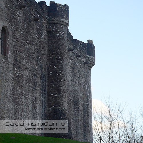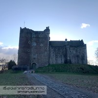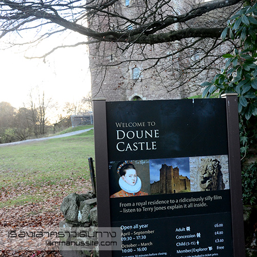 เป้าหมายต่อไปคือ Doune Castle ที่เมือง Doune ระหว่างทาง เป็นป่า สลับกับทุ่งหญ้า และเริ่มเห็นภูเขายอดขาวๆ รอบด้าน ถนนก็ยังคง 2 เลน แต่ไม่ได้ขับยากเย็นอะไร รถก็ไม่มากมายอะไร ผ่านเมืองเล็กๆน้อยๆไปเรื่อย จนเห็นป้ายเข้าตัวปราสาท เลี้ยวเข้าไปไม่มีใครเลย ตัวปราสาทปิด เลยเดินเล่นรอบๆ พื้นหญ้ามีเกล็ดน้ำแข็งเต็มไปหมด หนาวจับจิตจับใจ บรรยากาศวังเวงสิ้นดี จนมีคนงานเข้ามาเริ่มงานซ่อมแซมปรับปรุงถนนรอบๆปราสาท ค่อยมีเพื่อนให้หายหลอน
