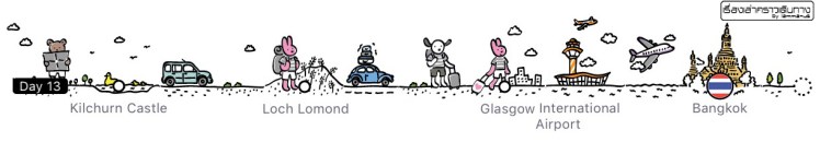 อิ่มดีก็เข้า Glasgow เลย เสียดายไม่มีเวลาอีกสัก ½ – 1 วัน จะได้เที่ยวชมเมืองสักหน่อย Flight ของเราเวลา 16:35 ก็เลยส่งรถคืนช่วงบ่ายที่สนามบินแล้วทำเช็คอินเลย Glasgow international Airport มีขนาดไม่ใหญ่โต ร้านขายของไม่ได้มากมาย ใครคิดจะมาเก็บซื้อของฝากที่นี่ก็เสียใจด้วย ไม่มีอะไรให้ซื้อเท่าไหร่ แต่มีร้านอาหารให้ฝากท้องได้ มีของ Duty free shop ทั่วๆไปบ้าง แต่ผู้โดยสารเยอะเต็มไปทั้งสนามบิน ปัญหาที่พบคือปัญหาเดิมๆ ไม่มีมนุษย์ที่ Information counter ให้ติดต่อ ไม่มีเจ้าหน้าที่เดินเกลื่อนกลาดให้เข้าไปถาม มีแต่โทรศัพท์วางไว้ โทรไปถามก็ได้คำตอบแต่ว่าข้อมูลยังไม่มีรอไปก่อน ยิ่งใกล้เวลายิ่งร้อนใจ gate ไม่ขึ้นสักที กว่าจะหาเจ้าหน้าที่เจอสักคนก็ใกล้เวลามากๆ สุดท้ายก็รู้ Gate จนได้ วิ่งไปขึ้นเครื่อง ได้กลับบ้านเสียที แต่ขากลับเราโดน 3 stop จาก Glasgow เราต้องไปต่อเครื่องที่ Dublin, Ireland แล้วถึงไปต่อเครื่องที่ Abudabi, Arab Emirate อีกต่อ เราเลือกเอง เพราะเวลาได้ตามต้องการ ถึงจะต่อ 3 ต่อก็ไม่มีปัญหา สุดท้ายก็ถึงสนามบินสุวรรณภูมิโดยสวัสดิภาพ เป็นทริปที่ประทับใจอีกทริปที่ใช้เวลาเที่ยวยาวนานสำหรับเรา บางคนอาจบอกว่าแค่ 2 สัปดาห์สั้นมาก เที่ยวยาวๆต้องเที่ยวเป็นเดือน แต่สำหรับเราคิดถึงบ้านมากแล้ว คิดถึงเมืองไทย คิดถึงอาหารไทย กลับบ้านให้หายคิดถึงแล้วจะออกเดินทางใหม่