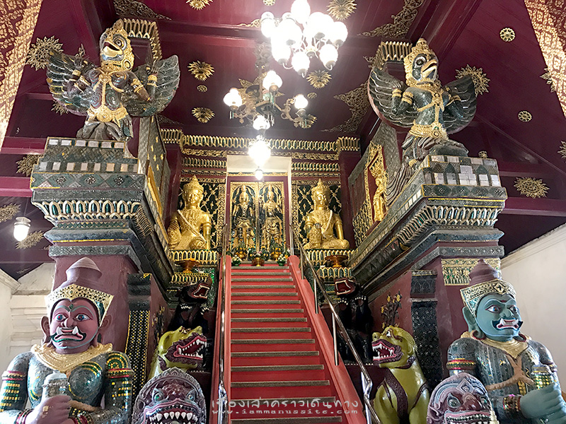 จากนั้นก็เดินเข้าไปในวิหารพระทรงม้า ซึ่งใช้เป็นทางขึ้นไปประกอบพิธีกรรมทางศาสนา อย่างเช่น การแห่ผ้าขึ้นพระธาตุ เข้าไปแล้วจะเห็นบันไดขึ้นไปสู่พระมหาธาตุเจดีย์ ด้านข้างมีรูปปูนปั้นเป็นรูปเจ้าชายสิทธัตถะทรงม้าทั้งด้านซ้ายและด้านขวา บันได 22 ขั้นทอดยาวขึ้นไปสู่ฐานชั้นบนของพระมหาธาตุเจดีย์ ชั้นล่างสุดเป็นรูปปูนปั้นของยักษ์คู่ชื่อ ท้าวกุเวฬุราช และ ท้าวทศรถ เหนือแท่นบนสูงขึ้นไปเกือบถึงเพดานเป็นรูปปูนปั้นครุฑคู่ ชื่อ ท้าววิรุฬปักษ์ และ ท้าววิรุฬหก และขนาบบันไดทั้งสองข้างขึ้นไปมีรูปปูนปั้นเป็นสัตว์ในหิมพานต์ ได้แก่ สิงห์ ราชสีห์ และ หมี อย่างละ 1 คู่ซ้ายขวา สุดบันไดซ้ายขวา เป็นปูนปั้นปิดทองของเทพผู้อภิบาลพระมหาเจดีย์ ด้านซ้ายมือเป็น ท้าวจตุคาม และด้านขวามือเป็น ท้าวรามเทพ นั่งคุกเข่าซ้ายหันหน้าออกมาเหมือนกันทั้งคู่ ประตูสำหรับเปิดเข้าไปสู่พระมหาธาตุเจดีย์เป็นประตูไม้มีรูปสลักนูนลอย ประตูด้านซ้ายมือเป็นรูปพระพรหม ประตูด้านขวาเป็นรูปพระนารายณ์ หรือพระวิษณุ (พระอิศวร) เทพผู้คุ้มครองโลก ตามความเชื่อของศานาพราหมณ์-ฮินดู