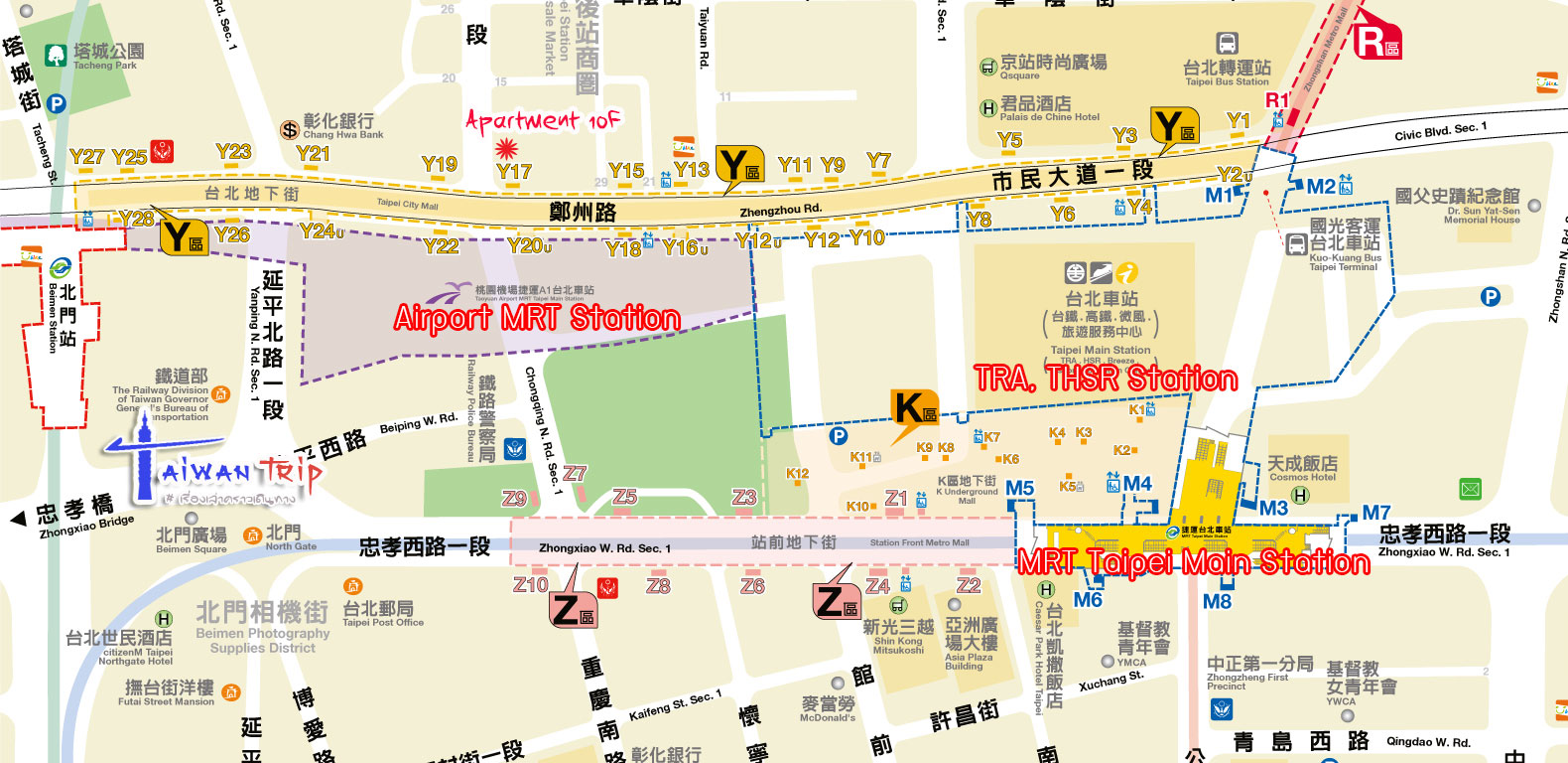 สถานีรถไฟกลางเมืองไทเป มีพื้นที่ใหญ่มาก ชั้นใต้ดินเป็นพลาซ่า ขายของ ขายอาหาร เดินได้ต่อเนื่องกันหมด แถมมีทางเชื่อมเข้าห้างหลายห้างด้วย การเลือกที่พัก หากเอาสะดวกก็เลือกละแวกนี้ได้ แต่ด้วยความกว้างใหญ่ของพื้นที่ ที่พักที่คุณเลือกอาจจะอยู่ใกล้ส่วนสถานีรถไฟ แต่ก็จะห่างจากสถานีรถไฟใต้ดิน