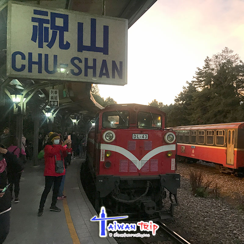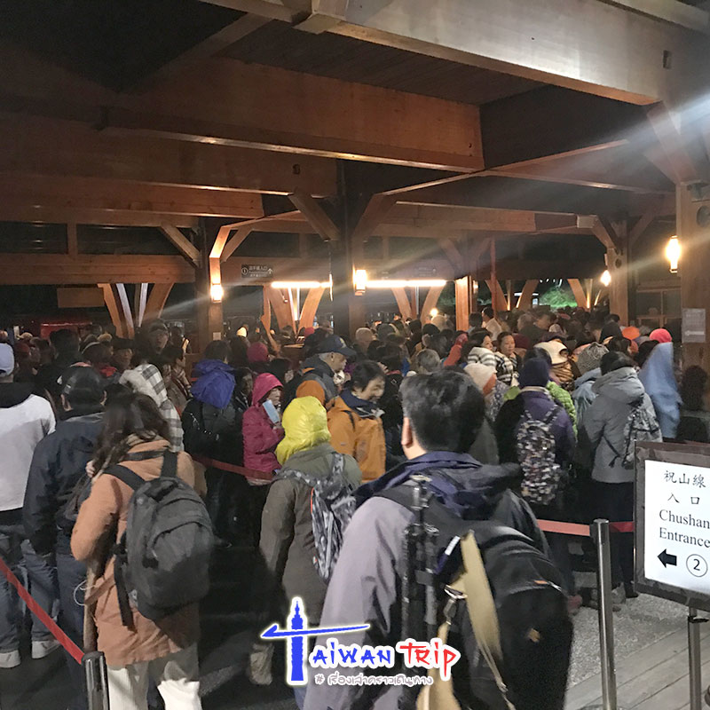 ซุกตัวในผ้าห่มอุ่นๆ แทบไม่อยากลุกจากเตียงตอนตี 5 แต่ก็ต้องรีบลุกล่ะ เตรียมทำน้ำชาอุ่นๆใส่กระติกติดไปด้วย ขนมนิดหน่อย จัดการแต่งตัวเต็มพิกัดเท่าที่เอามา พร้อมหมวกและผ้าพันคอ เดินฝ่าลมหนาวไปสถานีรถไฟ ผ่านเสาบอกอุณหภูมิแหงนดูยิ่งหนาวยะเยือกกับเลข 4°C เหอๆ ไปถึงสถานีรถไฟแทบช็อค คนล้นสถานี ยืนต่อแถววนกันเป็นลำไส้ใหญ่ สูสีกับคิวตรวจพาสปอร์ต รอบแรกเต็มก่อน ได้ขึ้นรถไฟรอบที่ 2 เลย คาดคะเนแล้วไม่ทันแสงแรกแน่ๆ รถไฟจาก Alishan Station ไปถึง Zhushan Station วิ่งนานพอสมควร ก็เลยได้เห็นฟ้าสีส้มระหว่างทาง ดูหน้าตาอารมณ์ของผู้แบกกระเป๋ากล้องหลายคนทุกชาติทุกภาษาในตู้เดียวกันก็ไม่สบอารมณ์นัก แต่ก็ช่วยไม่ได้ล่ะ ช่างมัน พระอาทิตย์ดวงเดียวกับเมืองไทยนั่นแหละ ฮา…..