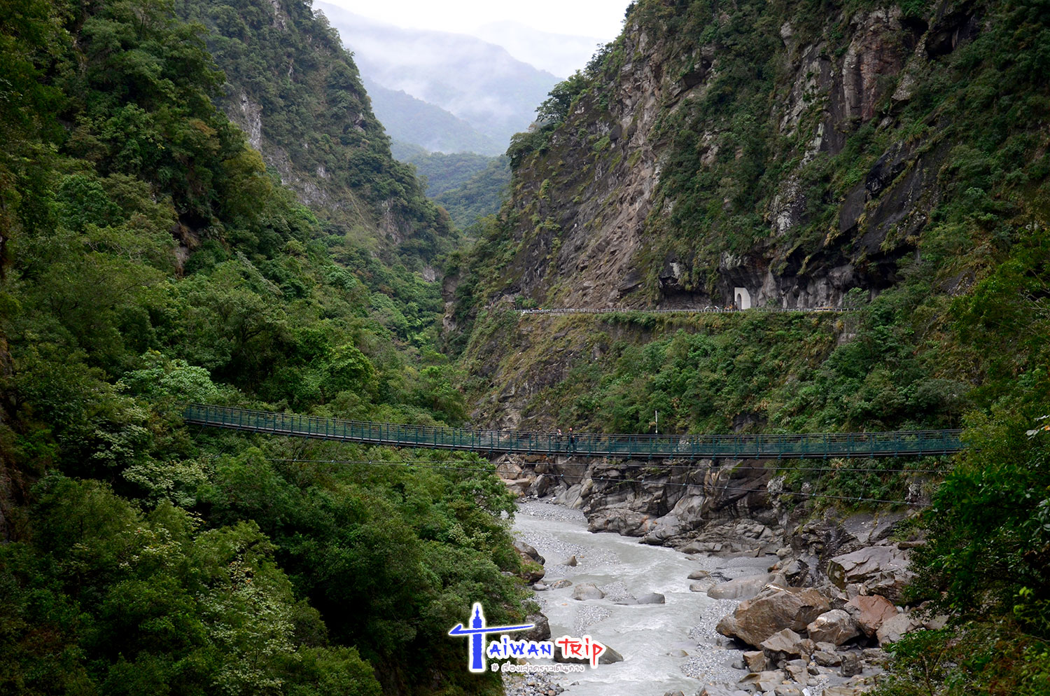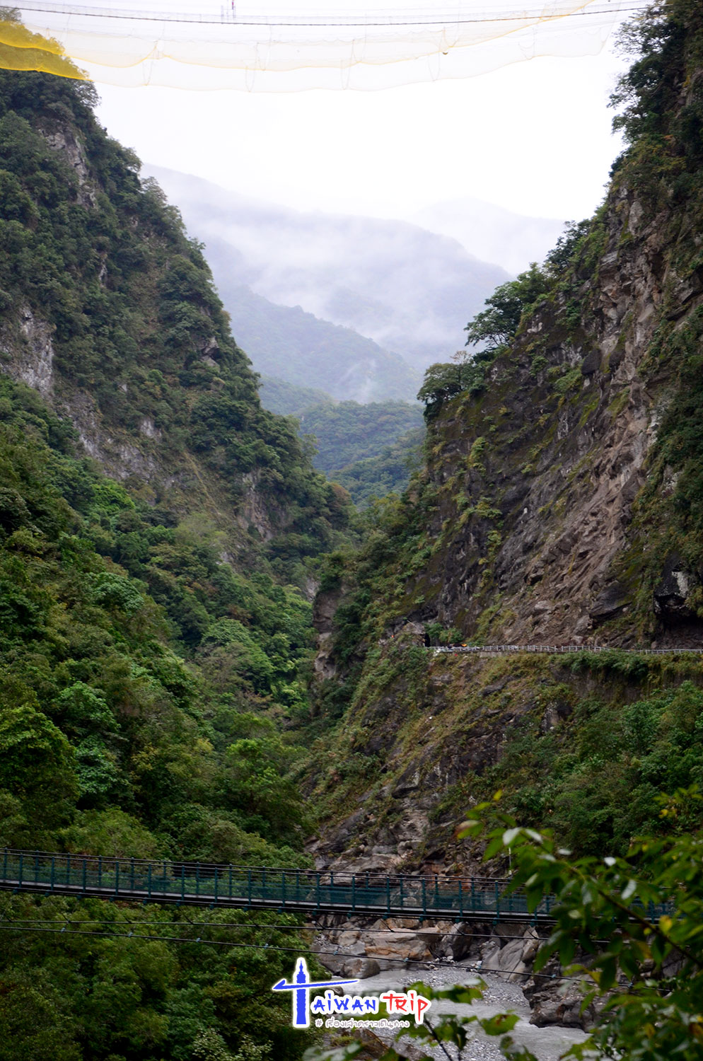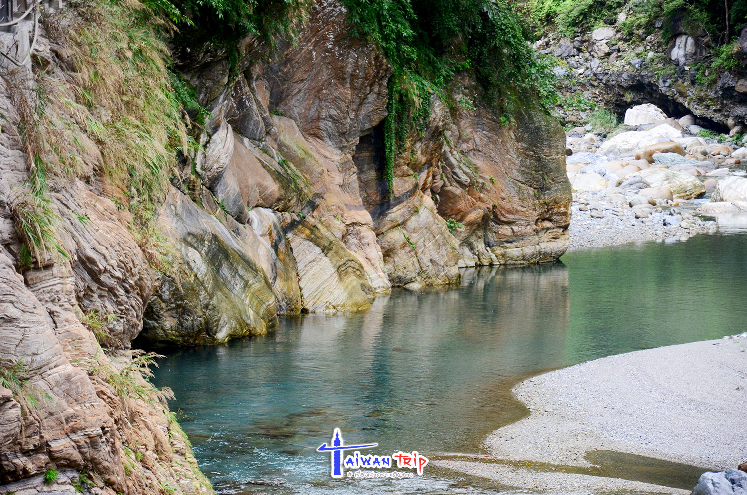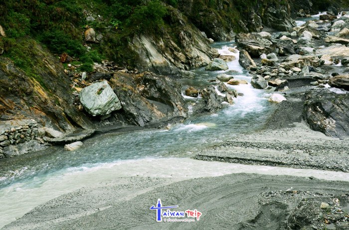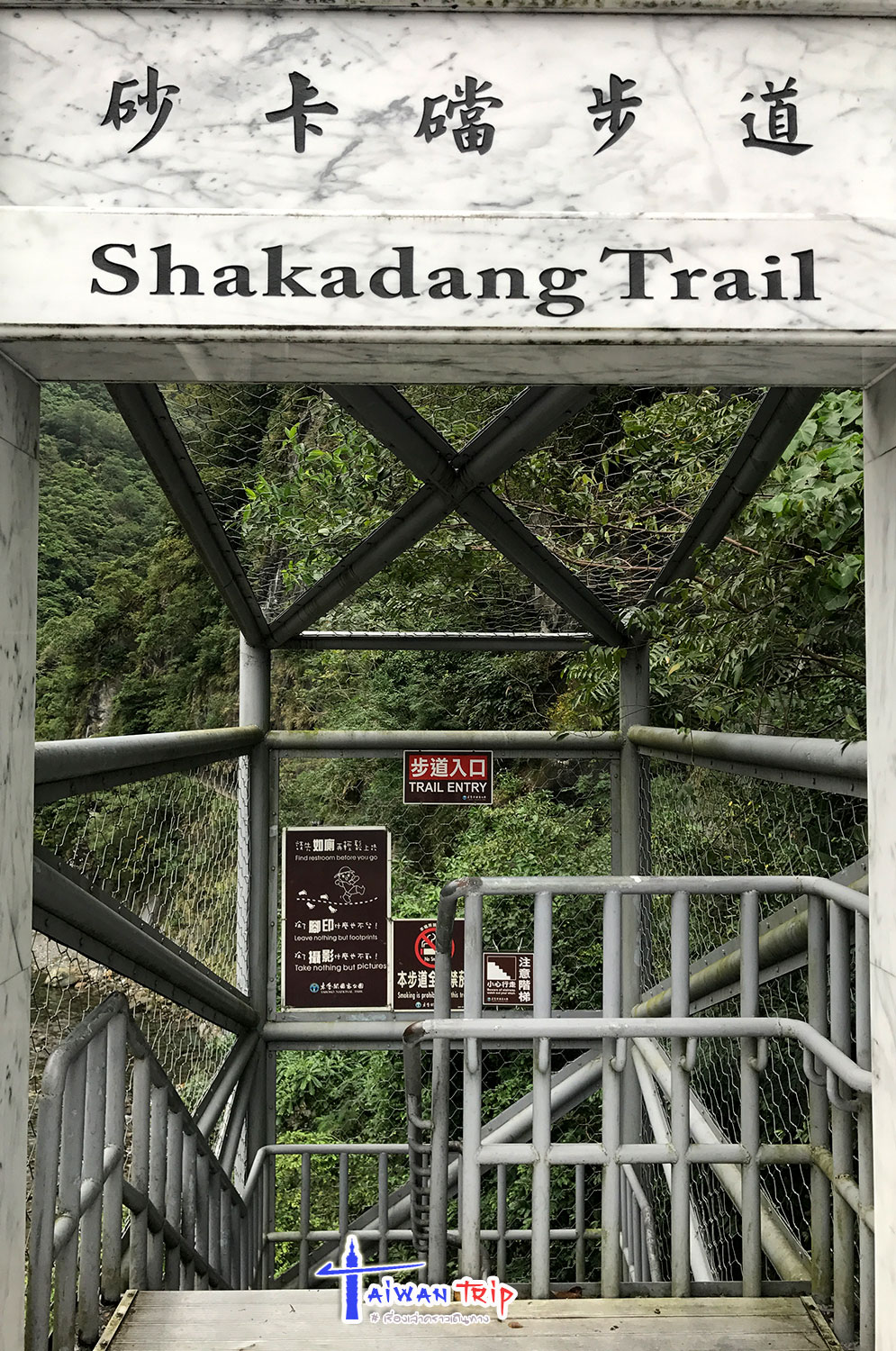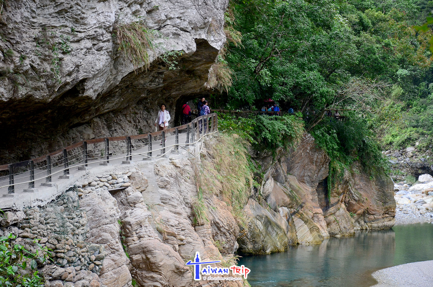 Shakadang Trail : จุดเดินชมผาหิน ต้องลงรถแถวๆสะพาน พี่แกก็ชี้ให้เดินลงบนไดไปด้านล่าง บอกให้เดินเลาะแม่น้ำเข้าไปเรื่อยๆ ให้ใช้เวลาไป-กลับประมาณ 1 ชม.นะ ซึ่งเราก็ไม่รู้ว่าเดินไปได้ถึงไหนหรอก แต่ก็กะเวลาดูว่าครึ่งชม.ถึงตรงไหนก็เดินกลับ ตามทางจะเป็นทางเดินลอดผาหิน สวยงามดี แม่น้ำสีเขียวสวยมากแม้วันนี้จะไม่มีแดด ฝนลงเป็นระยะๆแต่ไม่หนัก แค่ตกให้เปียกๆ เราเดินไปจนถึงตามที่พี่แกบอกแล้วก็เดินกลับ แต่ทางเดินมีต่อไปอีก อ่านป้ายดูเดินไปได้ถึงสะพาน….. เริ่มดีใจที่เหมารถมา ให้พี่คนขับควบคุมเวลาเที่ยว ถ้าเรามาเองคงเอ้อระเหยถ่ายรูปกันนานมาก ไม่ต้องไปจุดอิ่นกันล่ะ