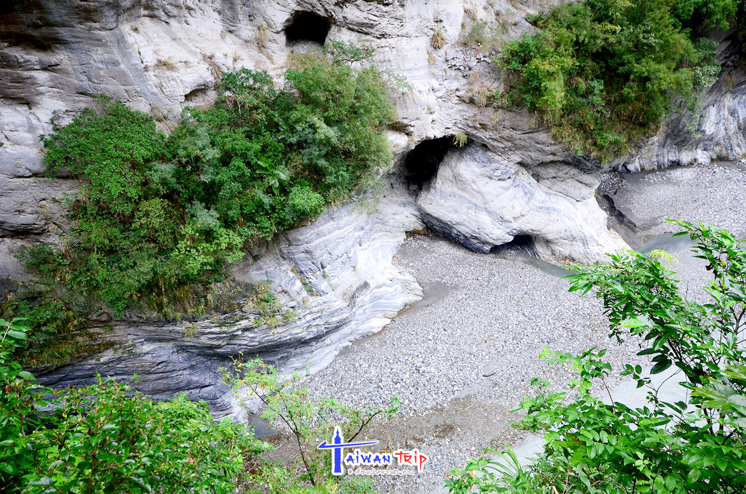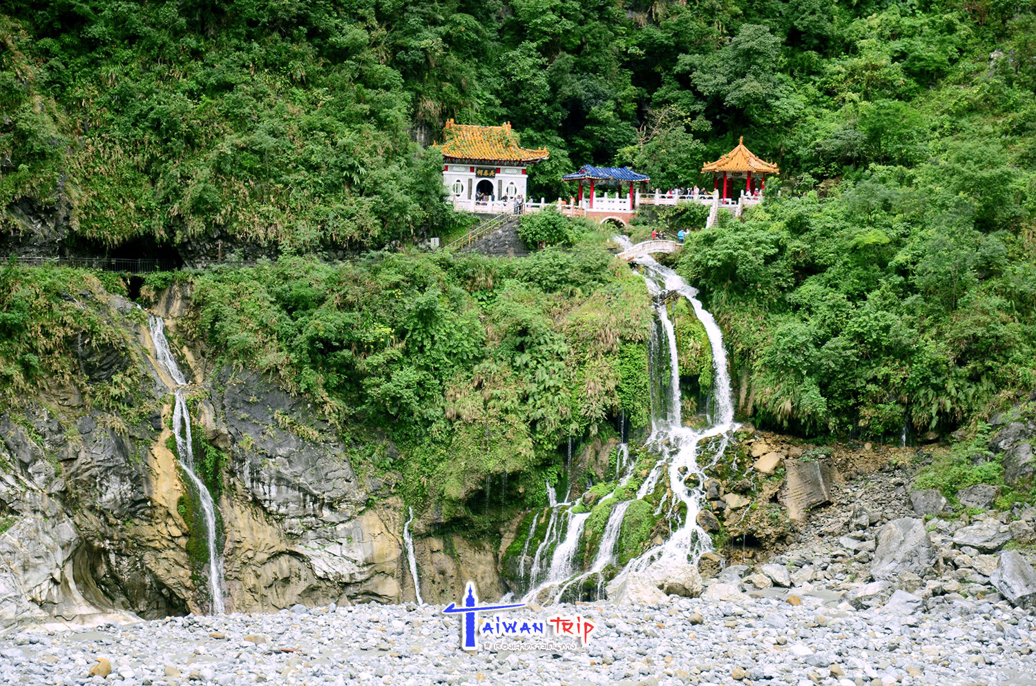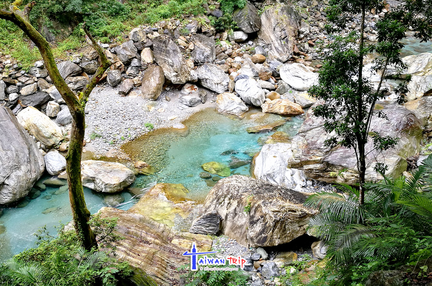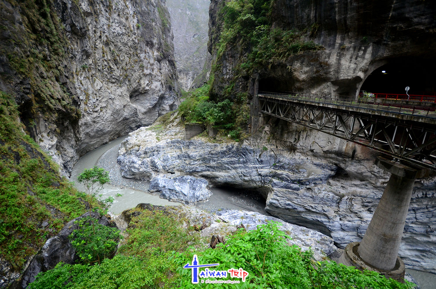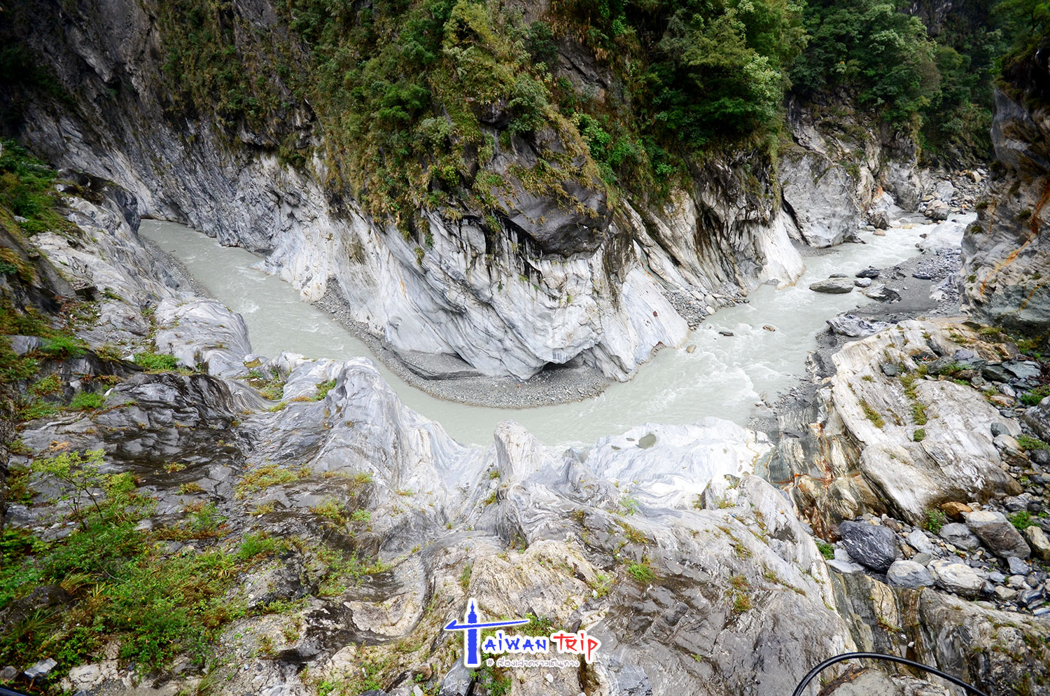 Shakadang Trail : จุดเดินชมผาหิน ต้องลงรถแถวๆสะพาน พี่แกก็ชี้ให้เดินลงบนไดไปด้านล่าง บอกให้เดินเลาะแม่น้ำเข้าไปเรื่อยๆ ให้ใช้เวลาไป-กลับประมาณ 1 ชม.นะ ซึ่งเราก็ไม่รู้ว่าเดินไปได้ถึงไหนหรอก แต่ก็กะเวลาดูว่าครึ่งชม.ถึงตรงไหนก็เดินกลับ ตามทางจะเป็นทางเดินลอดผาหิน สวยงามดี แม่น้ำสีเขียวสวยมากแม้วันนี้จะไม่มีแดด ฝนลงเป็นระยะๆแต่ไม่หนัก แค่ตกให้เปียกๆ เราเดินไปจนถึงตามที่พี่แกบอกแล้วก็เดินกลับ แต่ทางเดินมีต่อไปอีก อ่านป้ายดูเดินไปได้ถึงสะพาน….. เริ่มดีใจที่เหมารถมา ให้พี่คนขับควบคุมเวลาเที่ยว ถ้าเรามาเองคงเอ้อระเหยถ่ายรูปกันนานมาก ไม่ต้องไปจุดอิ่นกันล่ะ