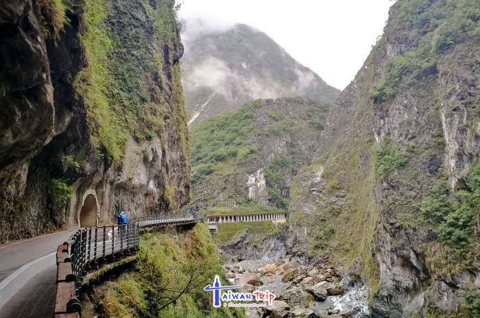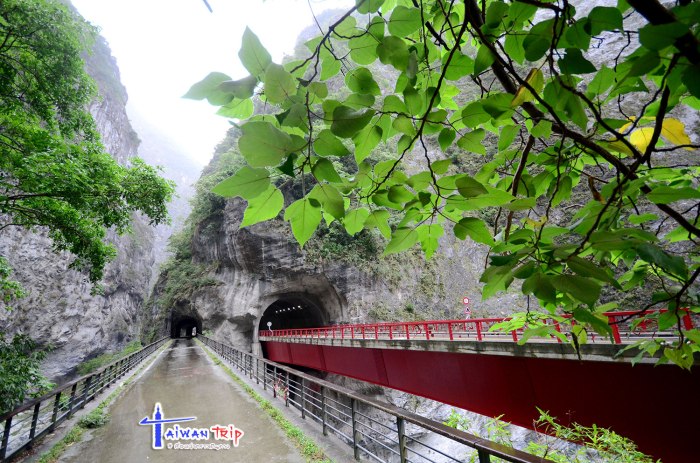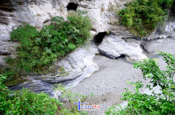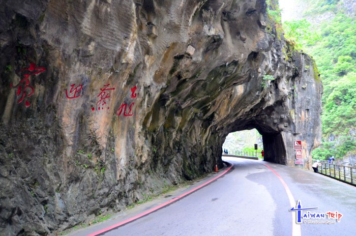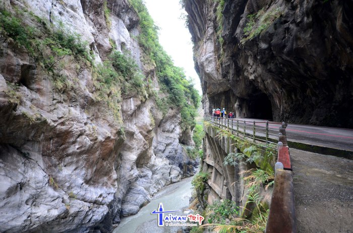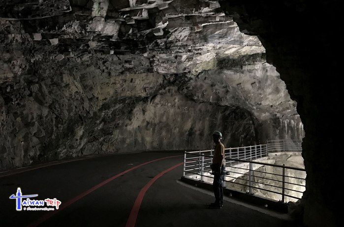 ก่อนไปจุดต่อไป พี่คนขับแวะขอยืมหมวกนิรภัย (Safety Helmet) ให้เราใส่ ลองดมๆดูแล้วไม่มีกลิ่นก็พอไหว การเดินชม Swallow Grotto Trail ให้ใส่หมวกเดินเข้าไป ยังไม่เข้าใจว่าให้ใส่ทำไม อะไรจะร่วงลงมารึ พี่คนขับพามาจุดเริ่มเดิน บอกว่าให้เดินต่อไปเรื่อยๆนะ เดี๋ยวไปรอปลายทาง ทางเดินริมถนนที่เจาะอุโมงลอดเขาไป เรียกว่า Tunnel of Nine Turns Tunnel (九曲洞步道 ) ด้านขวามือเป็นโตรกผา Swallow Grotto Trail แม่น้ำด้านล่างสีขุ่นเทาไม่เขียวใสเหมือนช่วง Shakadang แต่มองเห็นลายหินอ่อนของภูเขาแถบนี้ได้ตลอดทาง ทางเดินลอดผ่านอุโมงขนานไปกับถนน บางช่วงก็มืด บางช่วงก็มีแสงส่องถึง ที่ให้ใส่หมวกนิรภัยอาจจะห่วงช่วงมืดๆ เดินไปหัวโขกหินก็เป็นได้