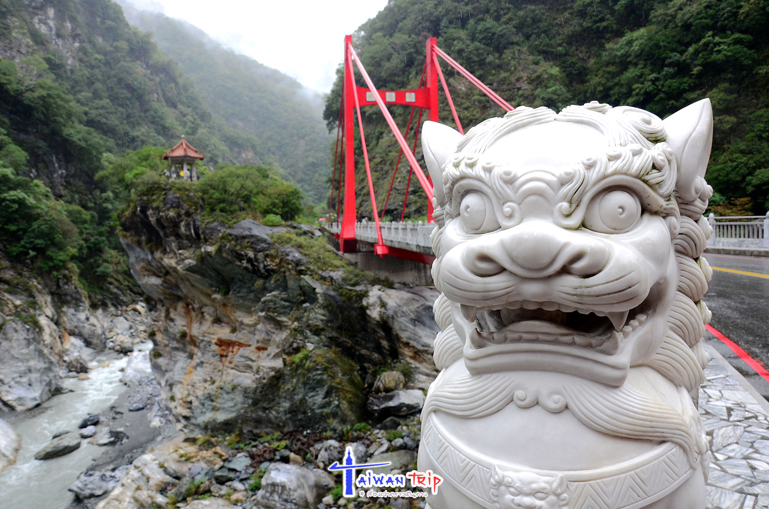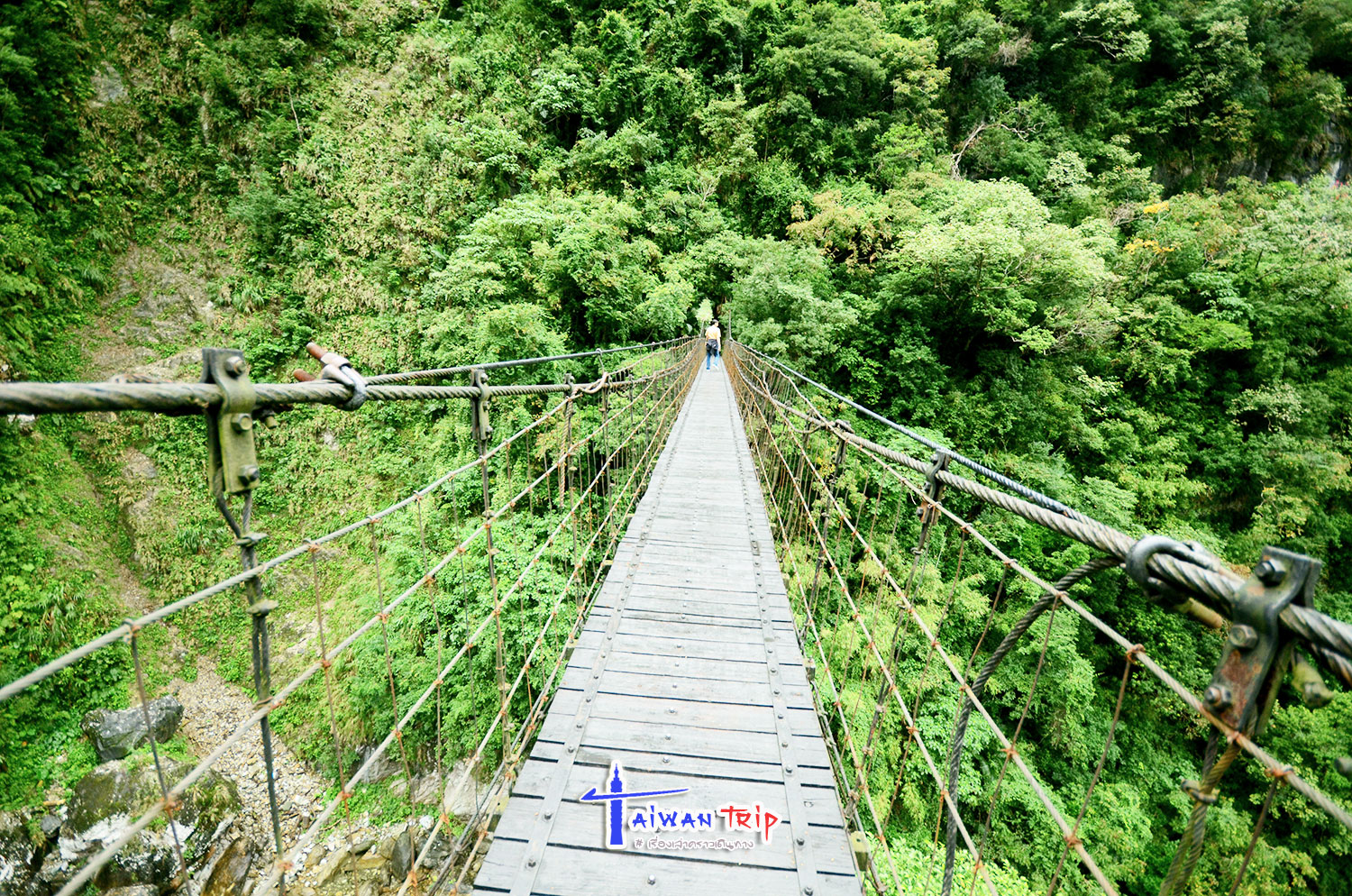 สะพานยาวๆที่เราเดินกันมามีชื่อเรียกด้วยว่า Jinheng Bridge ตั้งชื่อตามวิศวกรชาวไต้หวันนายจินเฮง ที่เป็นผู้ร่วมออกแบบสะพาน เสียชัวิตเพราะหินร่วงตอนแผ่นดินไหว เดินไปจนทะลุฝั่งตรงข้าม มีจุดพักให้แวะทานข้าว ทานกาแฟได้ พี่แกชวนกินข้าวก็เลยกินตรงนี้แหละ มีรูปปั้นนายจินเฮงอยู่ตรงนี้ด้วย สะพานนี้เดิมชื่อ Bailong Bridge (白龍橋, White Dragon Bridge) เพราะมองดูก็เหมือนมังกรสีขาวๆเลื้อยเลาะภูเขาจริงๆ เดินต่อไปอีกข้ามสะพานไปแล้วมีจุดชมวิวที่ป้ายบอกว่าเป็นจุดที่ดู Toroko Gorge ได้ดีที่สุดอีกจุด