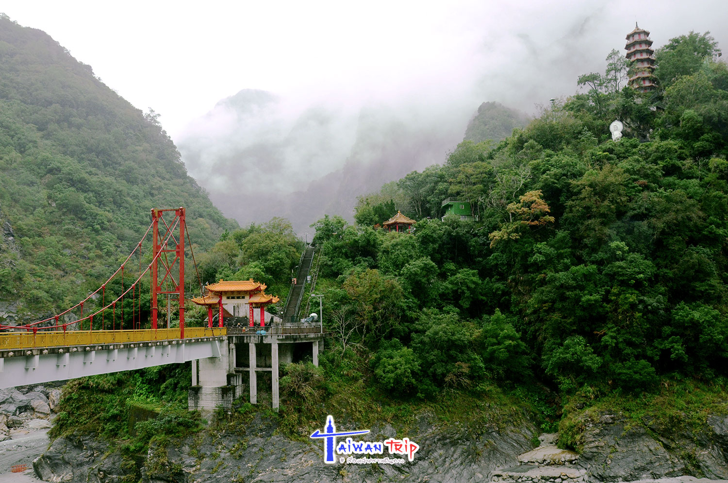 นั่งรถต่อไปอีกไม่ไกล ด้านซ้ายมือมองเห็นเก๋งจีนสูงยาว (Tian Feng Pagoda) พร้อมรูปปั้นสีขาว แทรกตัวในหมู่ไม้บนเนินเขา วันที่ฝนตกไม่มีแดดก็จะได้สายหมอกลอยเป็นสายมาแทน ก็สวยไปอีกแบบ เดินข้ามสะพาน Pudu ไปจะเจอ Xiangde Temple มีบันไดทางขึ้นไปที่เจดีย์ด้านบน ที่ลานหน้าวัดก้มมองลงไปที่แม่น้ำจะเห็นจุดที่แม่น้ำ 2 สายมาบรรจบกัน น้ำเขียวกับน้ำขุ่น เหมือนโขงสีปูนมูลสีครามทีโขงเจียมบ้านเรา แม่น้ำ Dasha กับแม่น้ำ Taci Jili มาบรรจบกันตรงนี้รวมเป็นแม่น้ำ Liwu ที่ไหลผ่านเข้าไปในอุทยานไท่ลู่เก๋อ