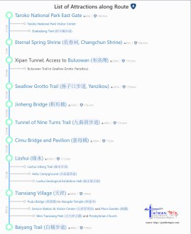 Arch of Taroko – Eternal Spring Shrine – Yanzidong – Jiuqudong Tunnel – Cimu Bridge – Tianxiang Recreation Area – Qingshui Cliff – Qixingtan Beach