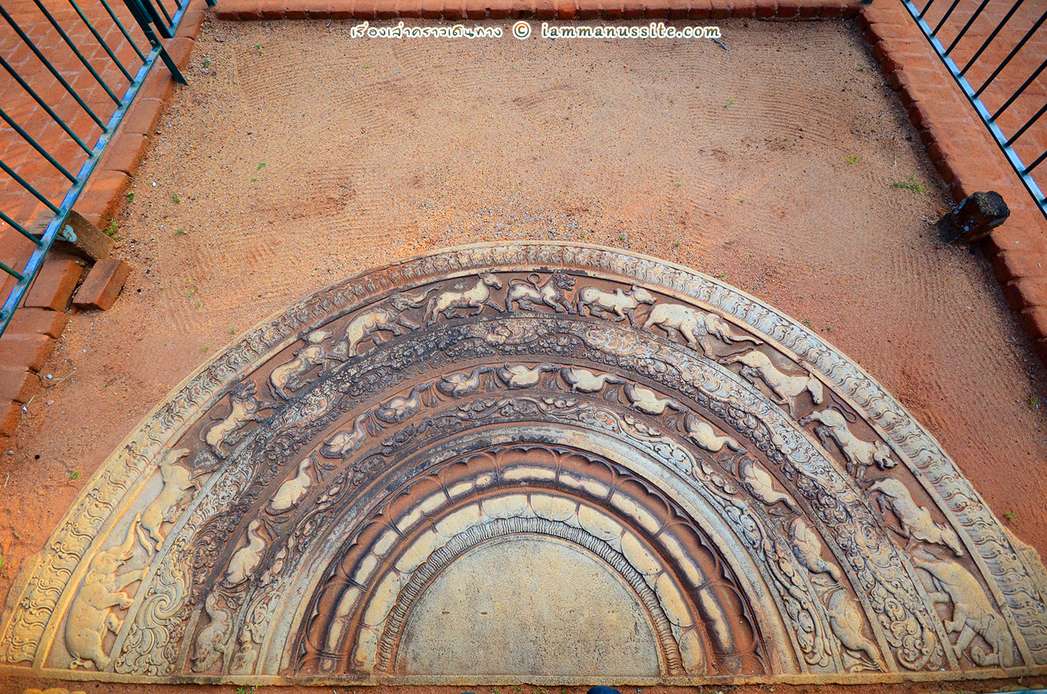 วนรถต่อไปอีกหน่อย พี่คนขับพาเราไปดู Moonstone ที่บริเวณทางเข้า Abhayagiri Monastery พวกเราก็เพิ่งรู้ว่าแผ่นหินครึ่งวงกลมแกะสลักบริเวณทางเข้าศาสนสถานต่างๆนี้เรียก Moonstone ซึ่งพวกเราเจอในทุกวัดที่เราไป ตอนแรกก็ไม่กล้าเหยียบเพราะว่าเป็นภาพแกะสลักสวยงามทุกที่ แต่เห็นชาวศรีลังกาเดินเหยียบกันเป็นปกติ ก็เลยกล้าเดินเหยียบบ้าง Moonstone ที่พี่ตุ๊กพามาดูนี้ เขาว่ากันว่าเป็น Moonstone ที่สมบูรณ์ที่สุดในศรีลังกา