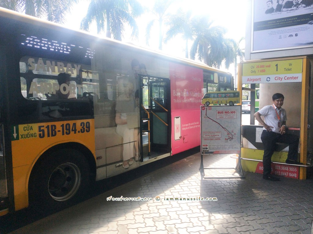 ตามที่หาข้อมูลมา การเดินทางเข้าเมืองแบบประหยัดแต่ก็สะดวกพอสมควรคือเดินออกจากอาคารแล้ว ข้ามถนนไปมองหารถโดยสารหมายเลข 109 ซึ่งจะมีป้ายบอกและมีรถจอดรออยู่ พิกัดคือด้านขวาๆ ประมาณประตู 9 – 10 เป็นรถปรับอากาศ วิ่งจากสนามบินไปสุดทางแถวตลาดเบนถั่น (Ben Thanh) ค่ารถราคา 20,000 เวียดนามดอง หรือ 1 US$ ก็ราวๆ 30 บาท ถือว่าถูกมาก หรืออยากถูกกว่านั้นก็ไปรถเมล์สาย 152 ราคาแค่ 5,000 เวียดนามดอง (+ค่ากระเป๋าเดินทางอีก 5,000) แต่ทั้ง 2 แบบเราไม่ได้ใช้บริการ เพราะเพื่อนมีรถมารับ สบายจริงๆคราวนี้