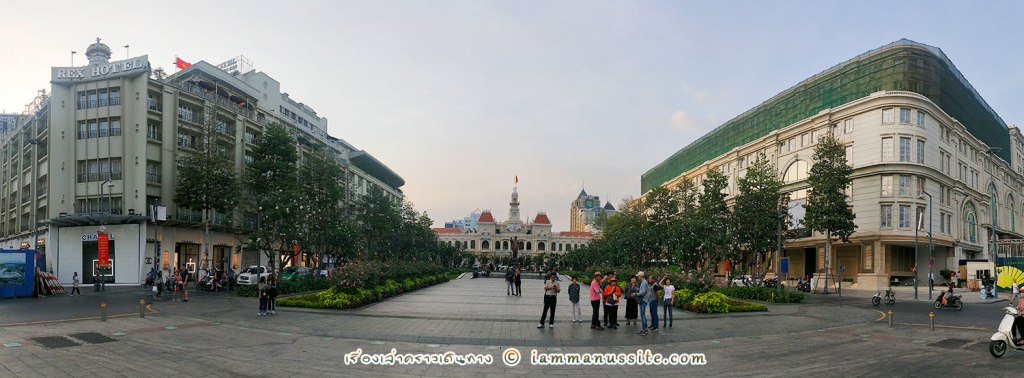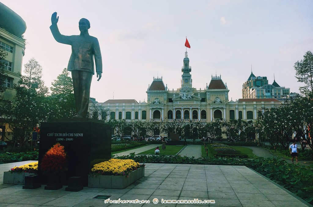 จากสนามบินเข้ามากลางเมือง ก็ยังคงเจอรถติดเหมือนสิบปีที่แล้ว ติดๆหยุดๆไปเรื่อย เพื่อให้เราเช็คอินว่าถึงโฮจิมินห์แน่นอนแล้ว รถจึงไปส่งพวกเราที่ HoChiMinh Square หรือที่เราเรียกว่าลานคนเมือง ต้องไปคารวะลุงโฮก่อนเลย ลุงโฮยืนโบกมืออยู่หน้า HoChiMinh City Hall อย่างนี้มาหลายสิบปีแล้ว แต่ตอนนี้มีการจัดพื้นที่รอบๆสวยงามขึ้น จากลานคนเมืองนี่สามารถหันหลังให้ลุงโฮ เดินเล่นตรงเกาะกลางยาวไปตามแนวถนน Nguyễn Huệ ได้ถึงแม่น้ำเลย ทางเดินนี้อารมณ์ถอดแบบจากยุโรป