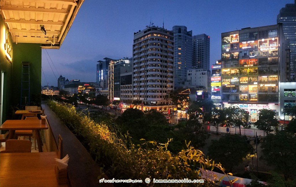 เราขึ้นไปเดินวนๆดูพอได้บรรยากาศ ก็เลือกกลับลงมาแล้วข้ามถนนผ่าน Nguyen Hue Walking Street ไปตึกฝั่งตรงข้าม ‘Saigon garden’ ขึ้นลิฟต์ไปชั้น 4 นั่งจิบ Mocktail ที่ร้าน Haan ชมบรรยากาศยามเย็น เห็น Cafe Apartment เต็มตา มองไปทางซ้ายไม่ไกลจะเห็น City hall พร้อมอนุสาวรีย์ลุงโฮที่ยืนยกมือทักทายผู้คนมาเป็นสิบๆปี แนะนำให้มาเย็นๆก่อนจะมืด นั่งพักขาไปจนมืดก็เริ่มมีแสงไฟ สวยงามไปอีกแบบ