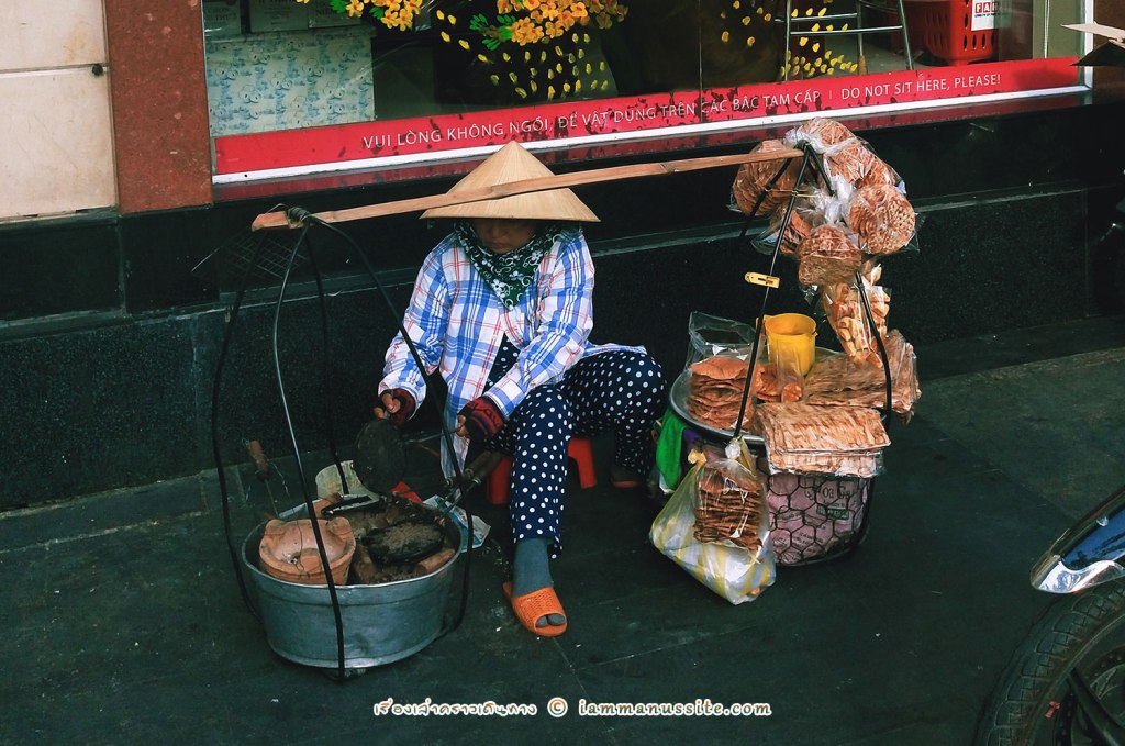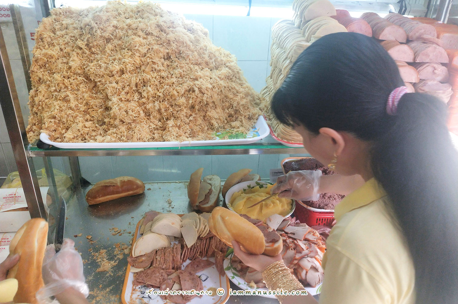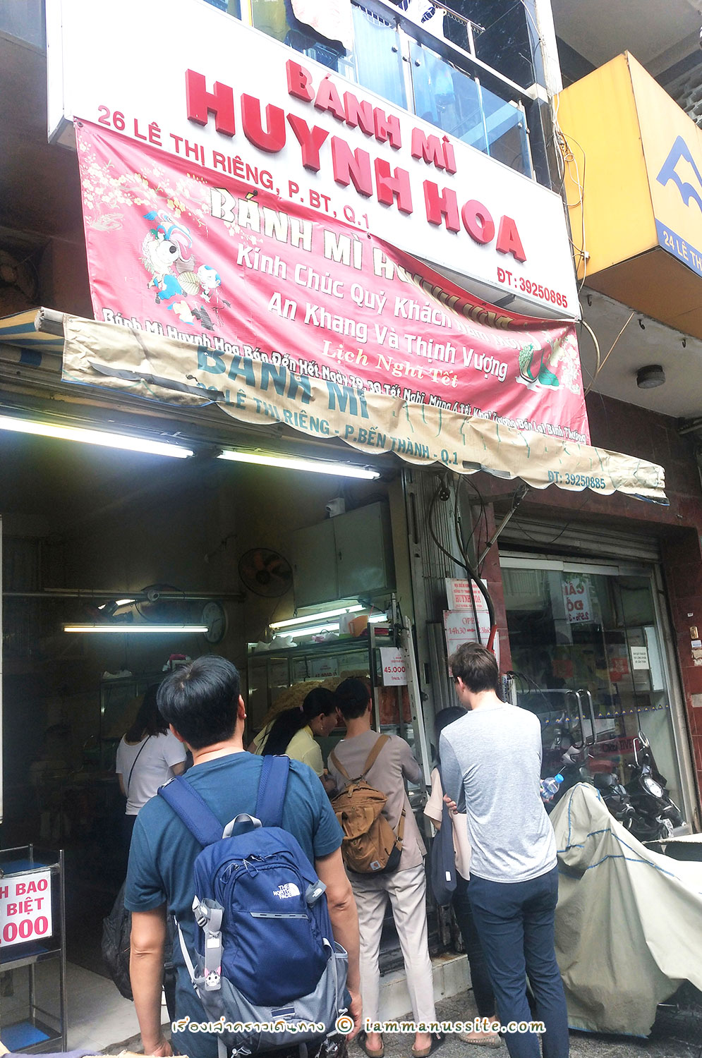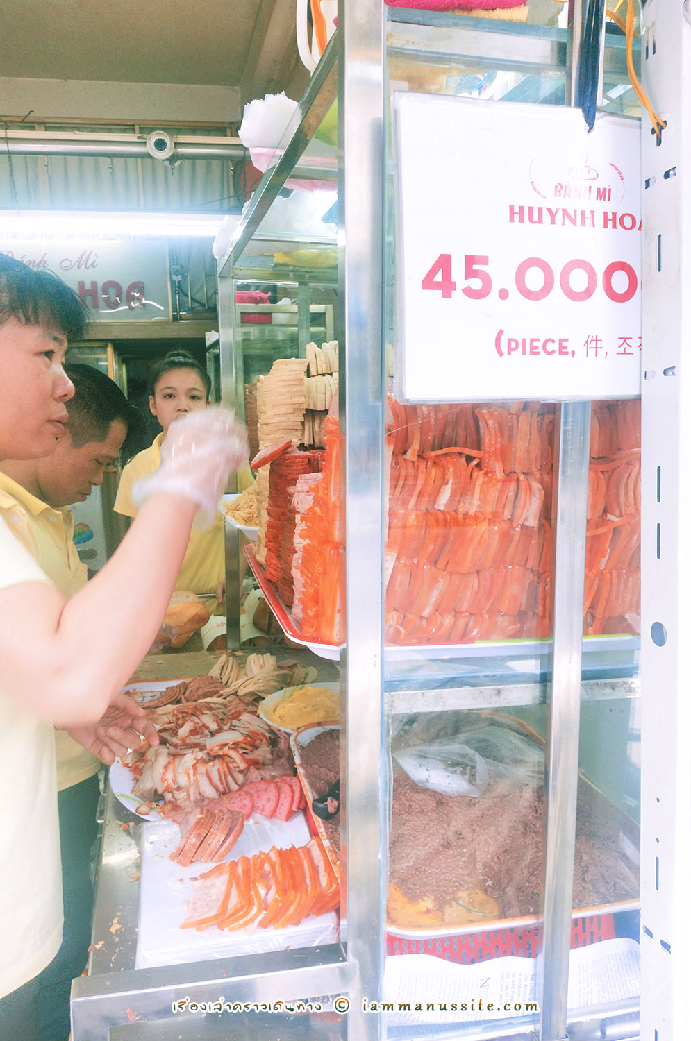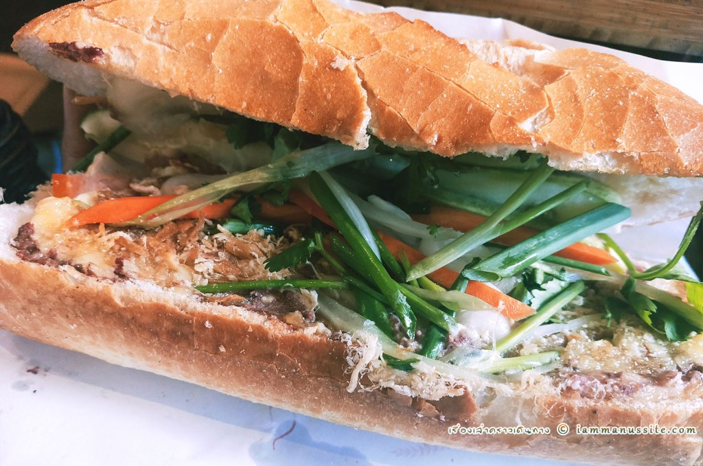 Banh Mi หรือ แซนวิสเวียดนาม เป็นอาหารกินง่ายยอดนิยมอย่างหนึ่งในเวียดนาม ทำจากขนมปังฝรั่งเศสที่แข็งนอกแต่นุ่มใน ผ่าตรงกลางยัดไส้กับผักเข้าไป หน้าตาเลยคล้ายแซนวิส หากินได้ตามข้างทางทั่วไป ทั้งป็นร้านหรือเป็นหาบเร่แผงลอย บางคนว่าเป็นอาหารเช้า แต่เราก็เห็นขายกันทั้งวันทั้งคืน แต่ร้าน Bánh Mì Huỳnh Hoa นี้เป็นร้านดัง ระดับบล็อกเกอร์บอกว่า Best in Saigon กันเลยทีเดียว เป็นร้านห้องแถว 1 ห้อง ช่วงเช้ามีคนมาต่อแถวซื้อกันยาวเหยียด เราแวะไปบ่ายๆคนไม่มาก ไม่ต้องรอนาน