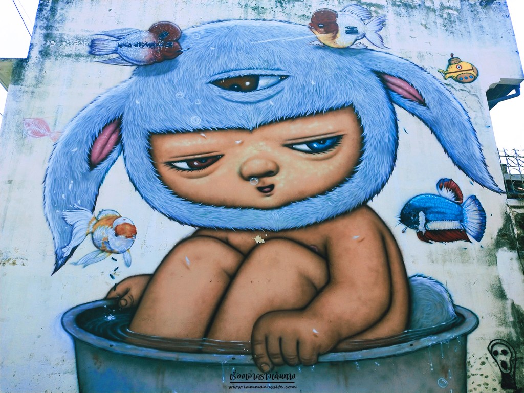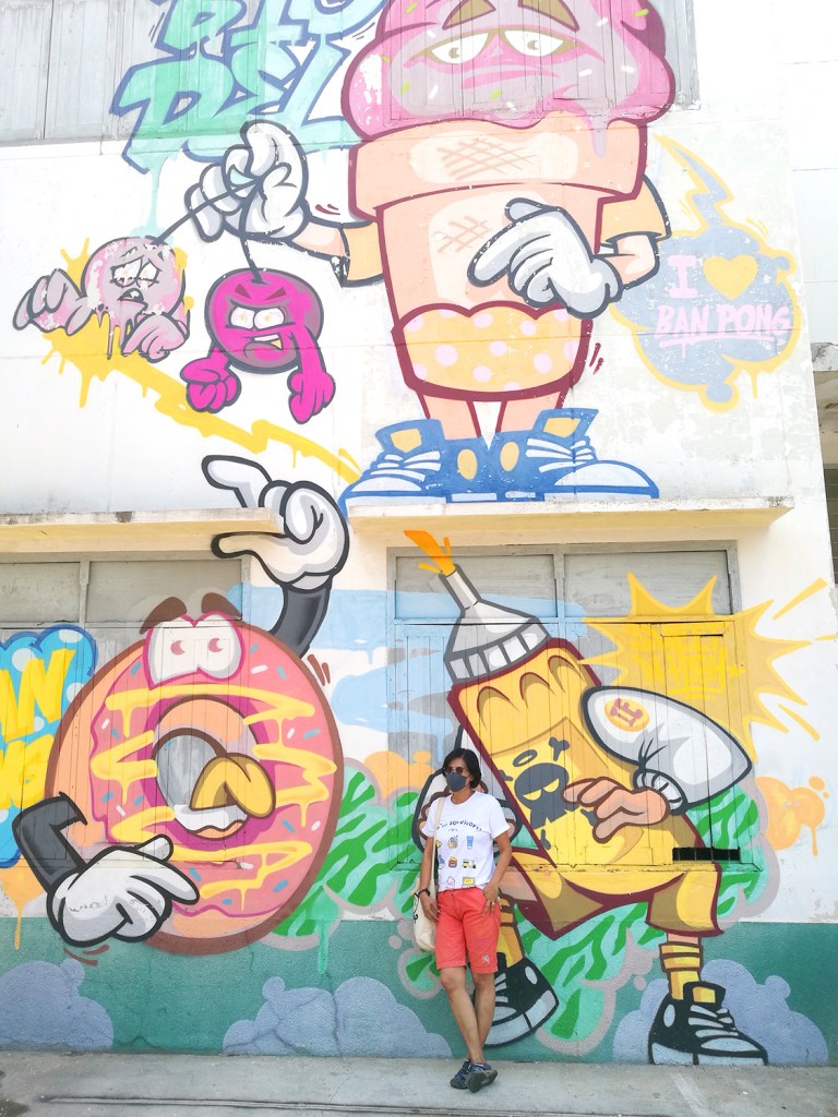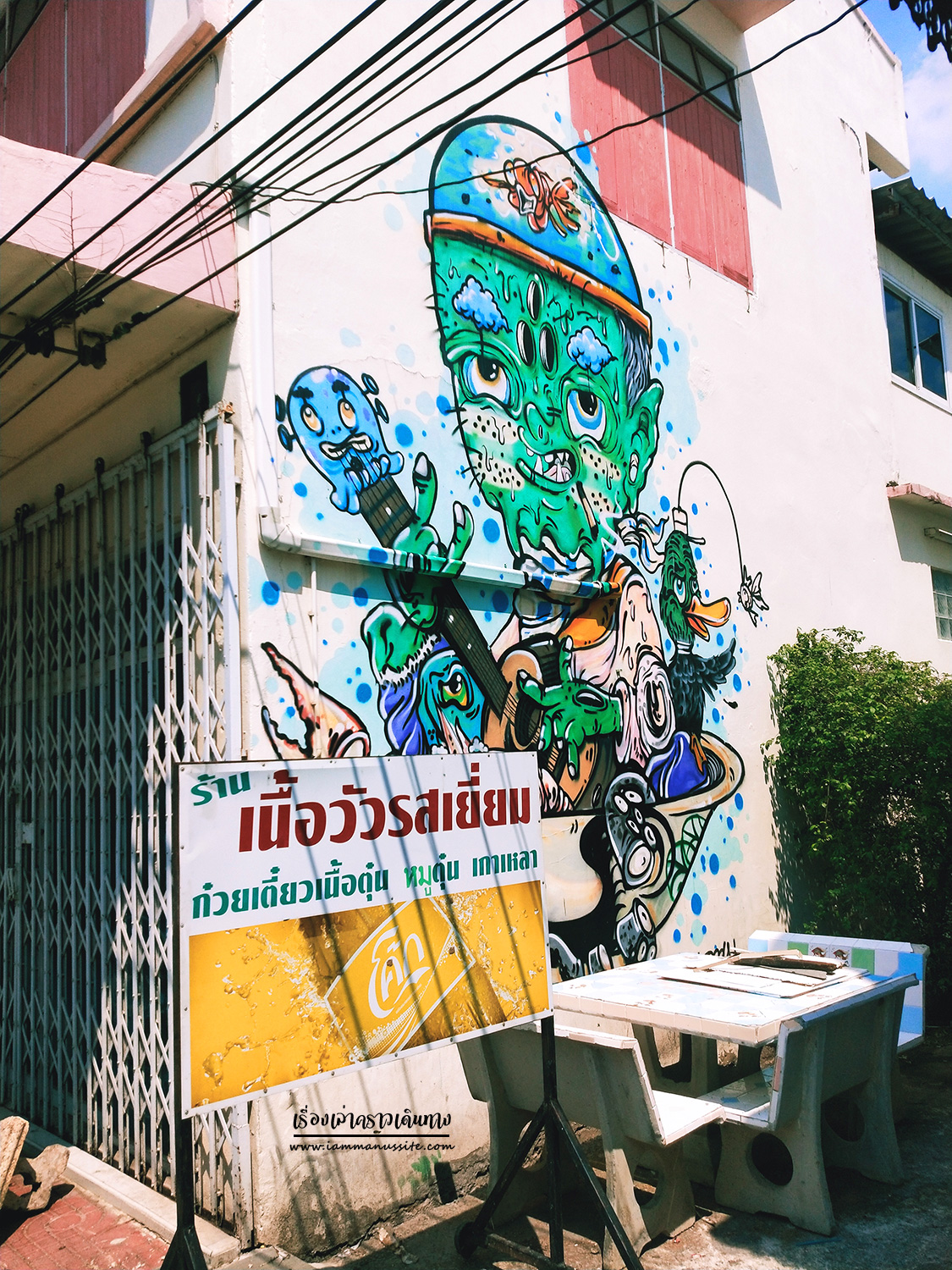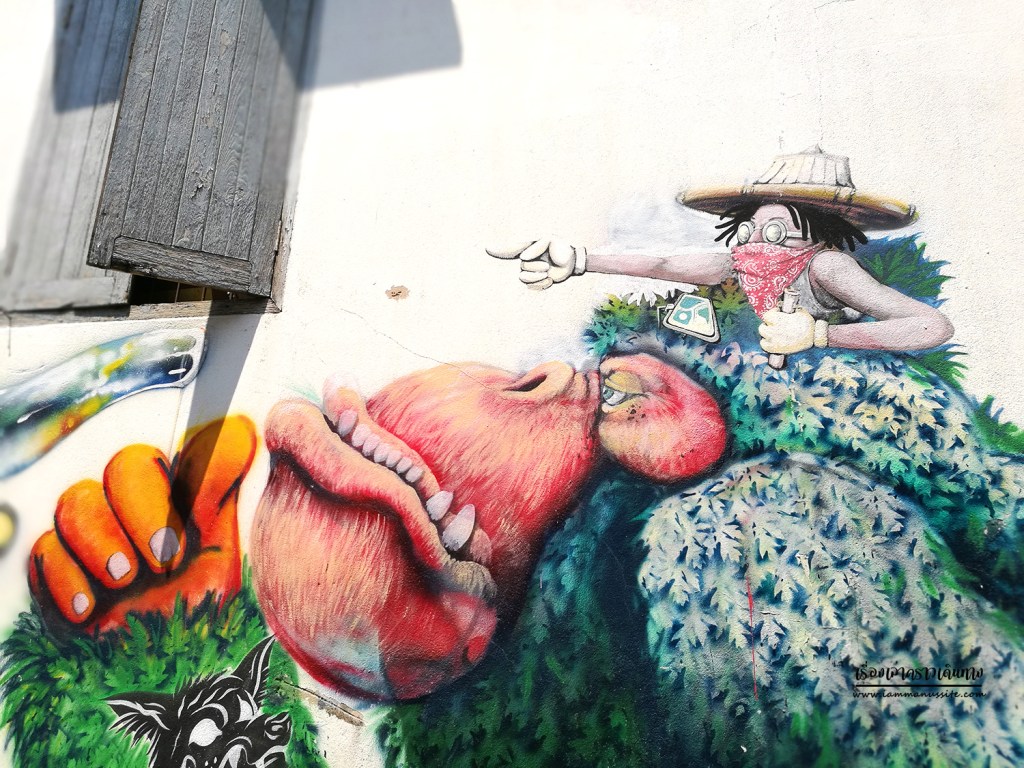 บ้านโป่ง ราชบุรี อยู่ใกล้กรุงเทพนิดเดียว ขับรถสบายๆชั่วโมงกว่าๆก็ถึง ที่มาตามล่าหากราฟฟิตี้เพราะได้อ่านเจอมานานแล้วว่า เคยมีการจัดงาน ‘สตรีทอาร์ต บ้านโป่ง’ ตั้งแต่ปี 2561 ว่าจะไปดูก็ไม่ได้ไปสักที มาสบโอกาสเอาตอนโควิดมา ก็จะน่าเสียดายที่ไม่ได้มีโอกาสแวะชิมของกินอร่อยๆเพราะนโยบายห้ามนั่งกินในร้าน ก็เลยใช้เวลาไม่นาน เดินๆถ่ายรูปแล้วกลับ