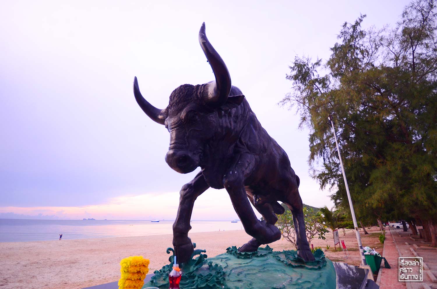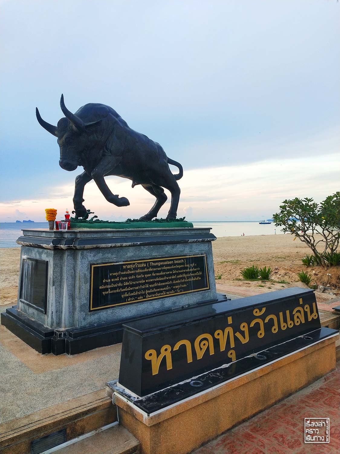 เวลามาเที่ยวแล้วก็อยากตื่นเช้าๆ ออกไปเห็นฟ้าสวยๆลมเย็นๆอากาศสดชื่น วันนี้ก็เหมือนกัน ตื่นมาฟ้าใกล้สว่าง แบกกล้องและขาตั้งเดินไปที่ริมหาด เพราะชุมพรอยู่ฝั่งอ่าวไทย ก็คือทิศตะวันออก ก็หวังให้ได้แสงเช้าสวยๆ หวังให้ได้เห็นพระอาทิตย์ค่อยๆลอยขึ้นจากขอบทะเล แต่วันนี้เมฆเจ้ากรรมก่อตัวหนาเป็นปึกตรงขอบฟ้าจรดขอบน้ำ และเฉพาะเจาะจงตรงที่พระอาทิตย์จะขึ้นเสียด้วย จึงได้เห็นแค่แสงเรืองๆหลังเมฆ แต่อากาศดีๆก็คุ้มค่ากับการตื่น เมื่อแสงไม่สวยก็ไม่ต้องถ่ายรูปก็ได้ เดินเล่นริมหาดทุ่งวัวแล่นไปเรื่อยๆ สวนกับคนมาวิ่งออกกำลังกายก็มี ออกมาเดินเล่นก็มี เดินไปไม่ไกลก็เจอรูปปั้นเจ้าวัวกระทิงตัวใหญ่สีดำทะมึน แล่น ภาษาใต้แปลว่าวิ่ง ทุ่งวัวแล่น จึงแปลว่าทุ่งวัววิ่ง เพราะเล่ากันว่าสมัยก่อนนั้นแถบนี้ยังเป็นป่า มีนายพรานมาล่าสัตว์ ครั้งหนึ่งยิงได้วัวกระทิงตัวใหญ่นายพรานและลูกหาบพากันไปแล่เนื้อ ลูกหาบก็พูดเยาะเย้ยว่า ทำไมไม่แล่นอีกล่ะ ว่าแล้ววัวก็ลุกวิ่งหนีไปเลย