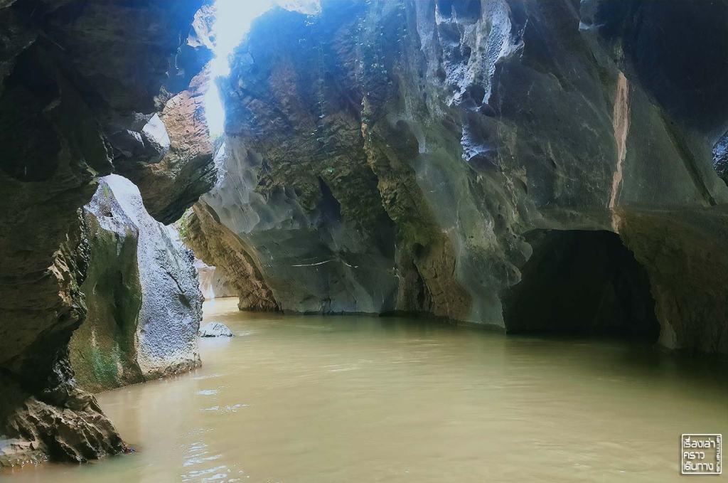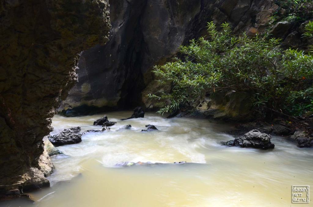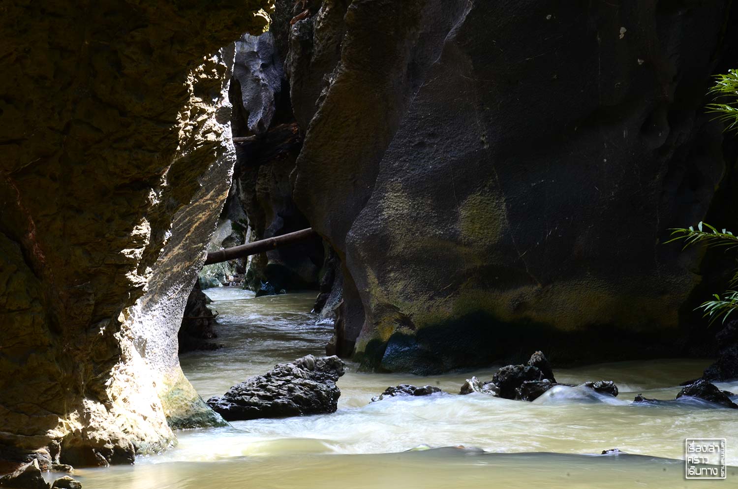 จุดเที่ยววันนี้จุดแรกอยู่ไม่ไกลจากบ้านเขาทะลุ ขับรถผ่านไปทางโรงคั่วเขาทะลุอินเตอร์เลยไปอีก 15 กม.ไปที่ คลองหินดำ ที่ได้ชื่อว่า แกรนด์แคนยอนแห่งเมืองชุมพร ที่เห็นจากรูป เป็นช่องผาที่มีลำคลองผ่าน ดูสวยแปลกตาดี แต่ก็ไม่ได้ตั้งความหวังอะไรมาก ซึ่งก็เป็นตามคาด จุดที่สามารถเดินลงไปชมได้ อยู่ตรงสะพานข้ามคลองหินดำ ในพื้นที่วัด จอดรถได้สะดวกสบาย ตอนที่เราไปไม่มีรถ ไม่มีคน เวิ้งว้างร้างมาก แต่ก็พอมีป้ายชี้ทาง เดินผ่านสวนยางไปเล็กน้อยก็มีบันไดทำทางลงไว้ให้อย่างดี การเที่ยวชม คือลงบันไดไปแล้วเดินลุยน้ำไปเรื่อยๆ ถ้ามาหน้าร้อนน้ำแห้งลุยได้แค่ตาตุ่มแต่น้ำจะใสสวยงาม เรามาหน้านี้ก็มีน้ำเยอะหน่อย แต่ก็ไม่ลึกมากแค่ครึ่งน่อง มีบางช่วงก็มาถึงโคนขาเหมือนกัน น้ำเยอะแต่น้ำก็สีแดงขุ่นมากด้วย ไม่ค่อยสวย ถ้าหน้าฝนเลยน้ำก็จะสูงเต็มทั้งหุบ ลงไปเดินไม่ได้ เล่นน้ำก็ไม่ได้อันตราย จุดที่คนมาเที่ยวคือมาดูความสวยงามที่ช่องผาหิน 2 ข้าง ก็ต้องมาตอนน้ำไม่สูงมากพอเดินลุยได้ เอาจริงก็ไม่ได้สวยอะไรมากนัก ถ้ามีเวลาก็แวะ ไม่มีเวลาก็ไม่ต้องแวะ ไม่ถือว่าพลาดอะไร