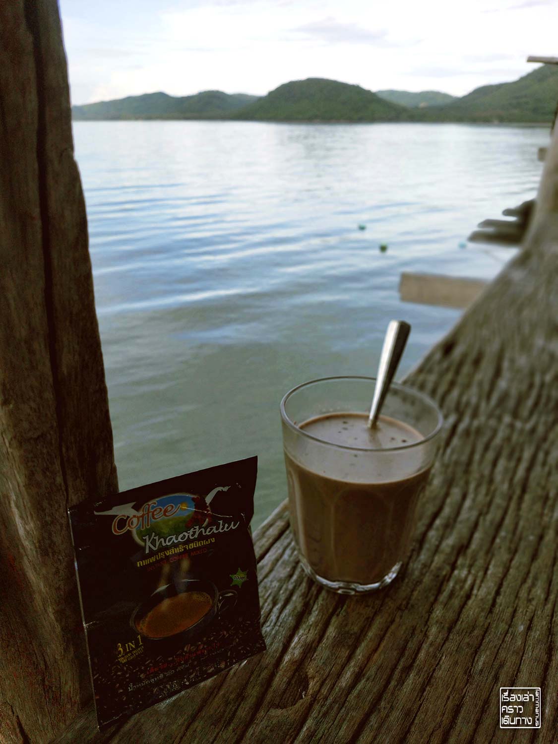 เดินกลับบ้านไปชงเครื่องดื่ม มานั่งจิบที่ระเบียงริมน้ำ พูดคุยกับนักท่องเที่ยวคนอื่นๆ มีกลุ่มที่จะออกเดินทางตี 5 ไปดูทะเลหมอกที่เขาหมื่นชะนี อันนี้ยังไม่เคยไป อยากไปเหมือนกัน เอาไว้ครั้งหน้านะ