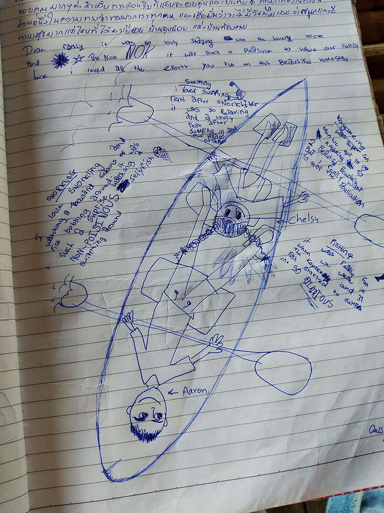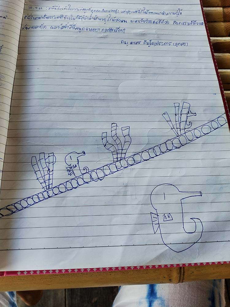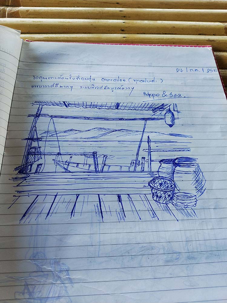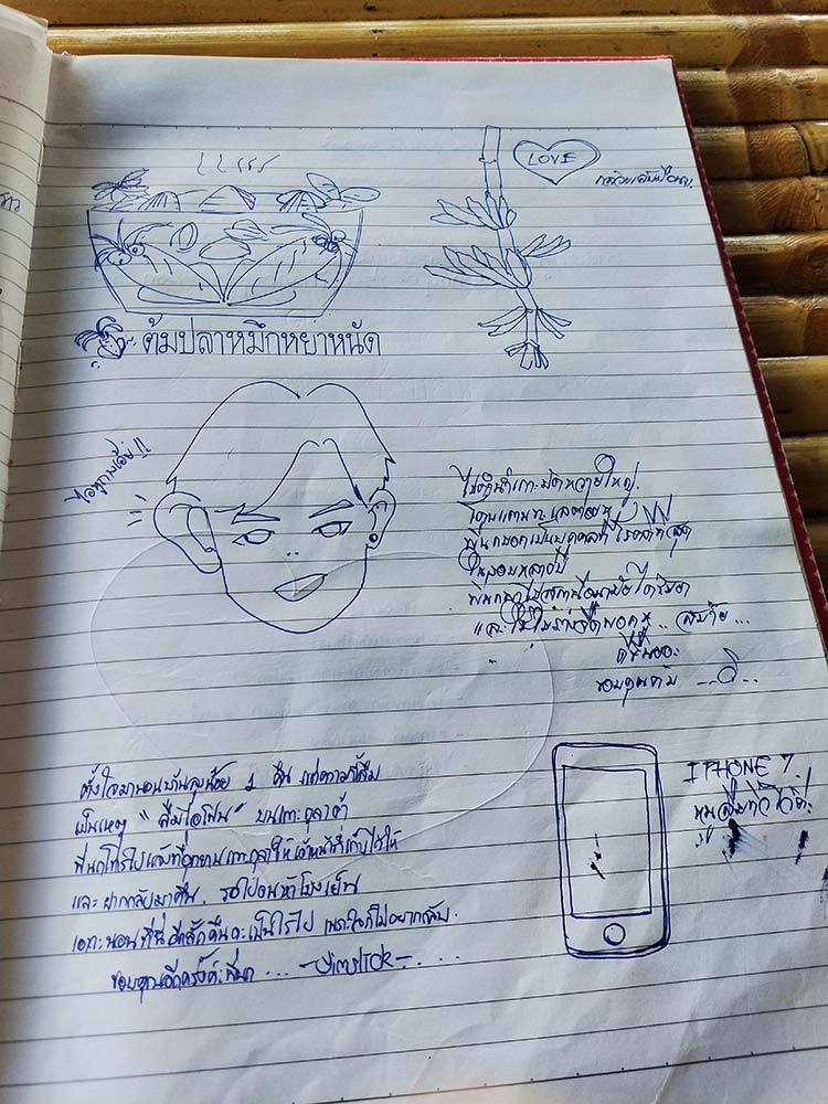 ระหว่างจิบกาแฟก็เอา Guestbook มานั่งอ่าน มันน่ารัก อบอุ่นจนอดไม่ได้ต้องถ่ายรูปมา มีทั้งคนไทยคนต่างชาติ มีเด็กน้อยวาดรูป มีศิลปินสเก็ชต์ภาพด้วยปากกา มีทั้งวาดลงสีสวยงาม คิดดูแล้วกันว่าต้องมีความสุขและรื่นรมย์ขนาดไหนถึงบรรยายออกมาเป็นรูปภาพได้
