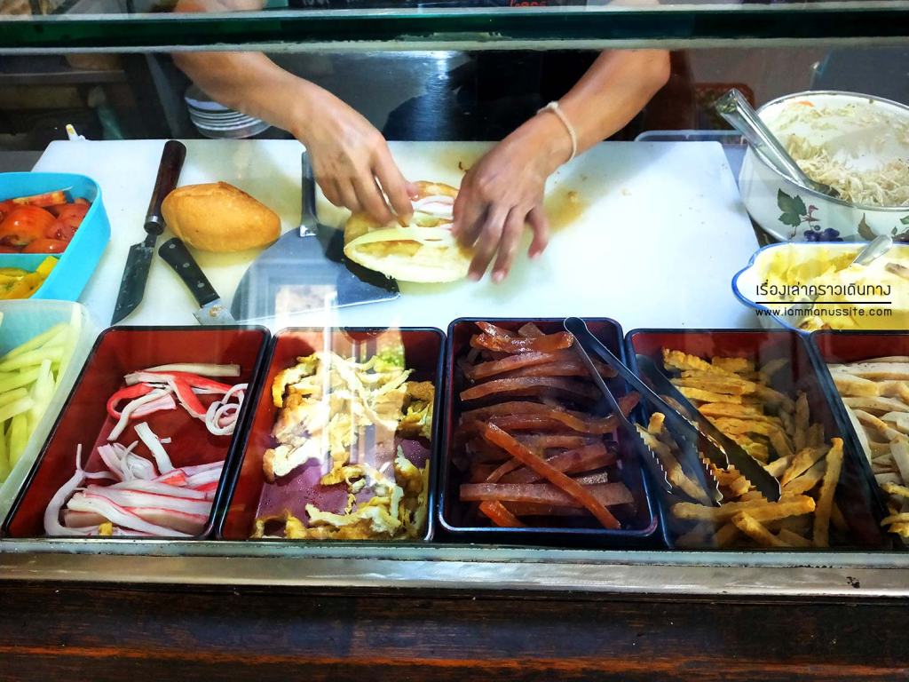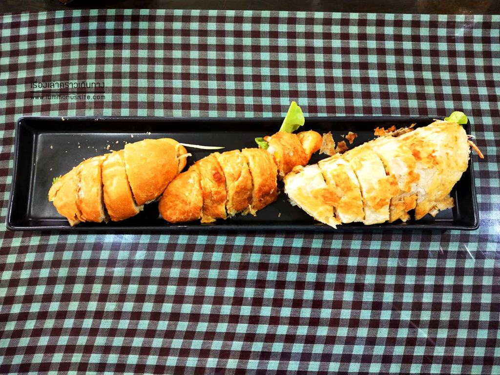 พวกเราไปกันหลายคนเลยได้สั่งเมนูฮิตหลายอย่าง อันที่เป็นหน้าเป็นตาของร้านอย่างแรกคือ ขนมปังฝรั่งเศสสอดไส้ พวกเราสั่งแบบ 3 สหาย คือ ปัตเต้ , ครัวซองต์ และโรตี เอามาแบ่งกันกินแกล้มชา-กาแฟ อาหารหลัก สั่งกันหลายอย่าง เช่น เส้นหมีขาวเห็ดชาจีน+กระดูกอ่อน (หรือเป็นข้าวต้มก็ได้), สลัดหลวงพระบางใส่น้ำมะขาม อันนี้ก็อร่อยมีรสหวานอมเปรี้ยวของน้ำมะขาม, ไข่ดาวหน้าหมู อันนี้มาแปลก เป็นไข่ดาวกับหมูผัดซ๊อส, สเต็กแม่โขง ที่ประกอบด้วย สเต็กเนื้อหรือหมู กับสลัดฮอยอัน และบะหมี่ แมนูนี้ก็แปลก อาหารถือว่ารสชาติถูกปาก ราคาก็ตามความโด่งดัง คือราคาสูงหน่อย