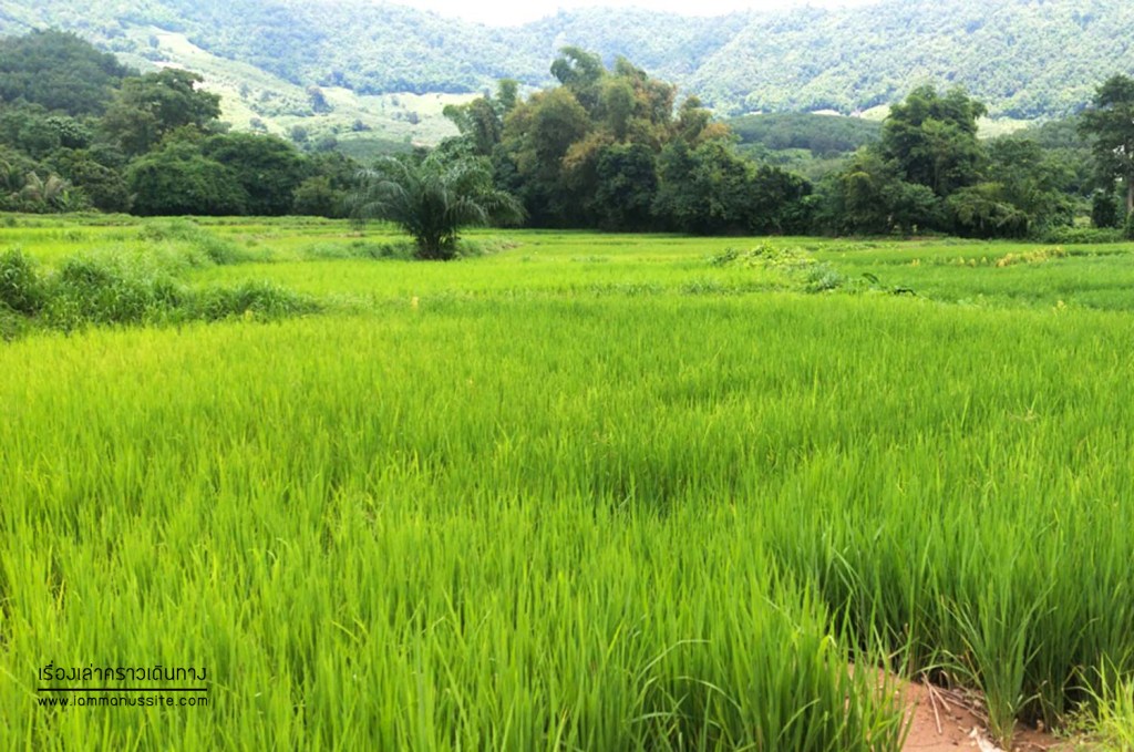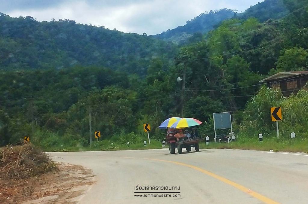 ช่วงแรกออกจากที่ทำการผู้ใหญ่บ้าน วิ่งบนถนนไปสักพัก เลี้ยวเข้าหมู่บ้านเป็นถนนผ่านบ้านผ่านร้านค้า จากนั้นเป็นวิวทุ่งนาป่าเขา แล้วถึงเลี้ยวขวาไปทางที่คู่ควรกับรถอิแต๊กเท่านั้น กระเด้งกระดอนกันลงไปที่ลำน้ำเล็กๆเหมือนลำธาร แล้วจากนั้นอิแต๊กก็พาลุยลำน้ำไป ก็ได้บรรยากาศแปลกๆดี เอาเครื่องดื่มมานั่งจิบไป คุยกันไป ตะโกนคุยแข่งกับเสียงรถอิแต๊กเป็นที่สนุกสนาน อิแต๊กพาผ่านลำธาร ขึ้นฝั่งไปผ่านนาข้าว ไร่มันสำปะหลัง ผ่านสวนยาง เลาะป่าโปร่ง ไปสุดทางที่จุดทานอาหารกลางวันริมน้ำตก ที่มารู้ทีหลังว่าน้ำตกเล็กๆนี้มีชื่อด้วยนะ “น้ำตกห้วยช้างพลาย”