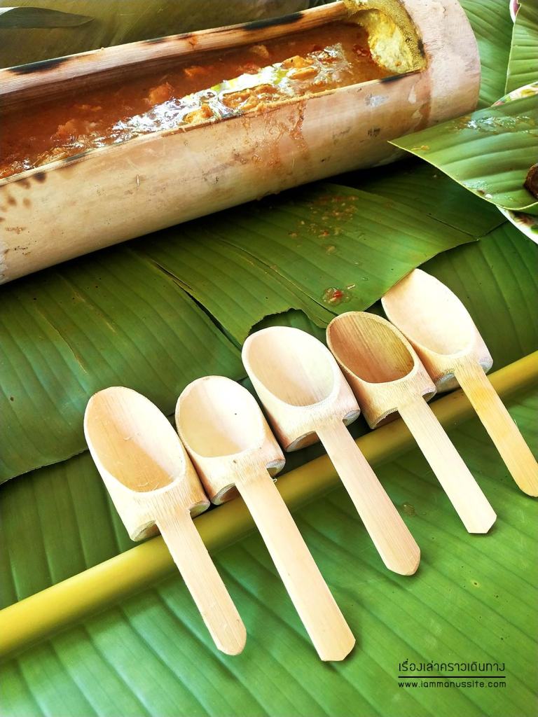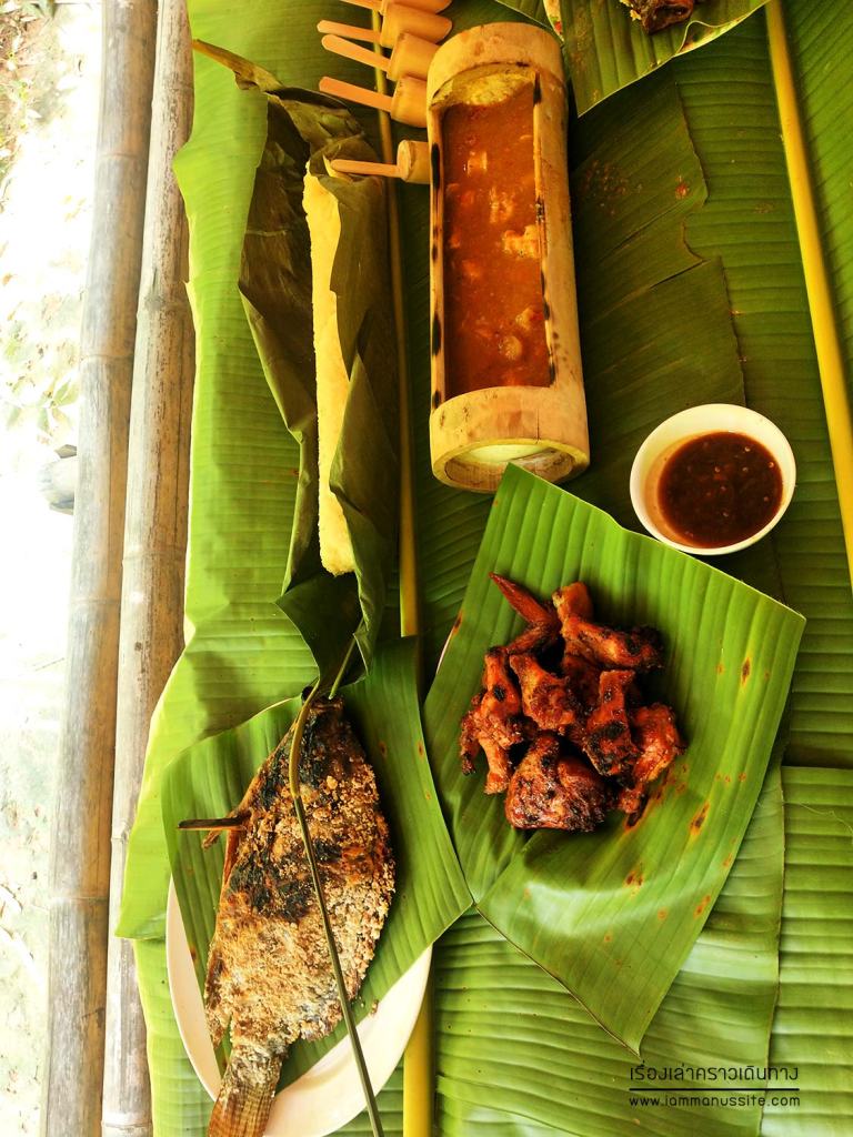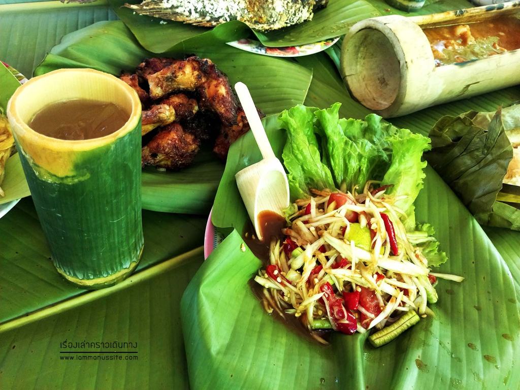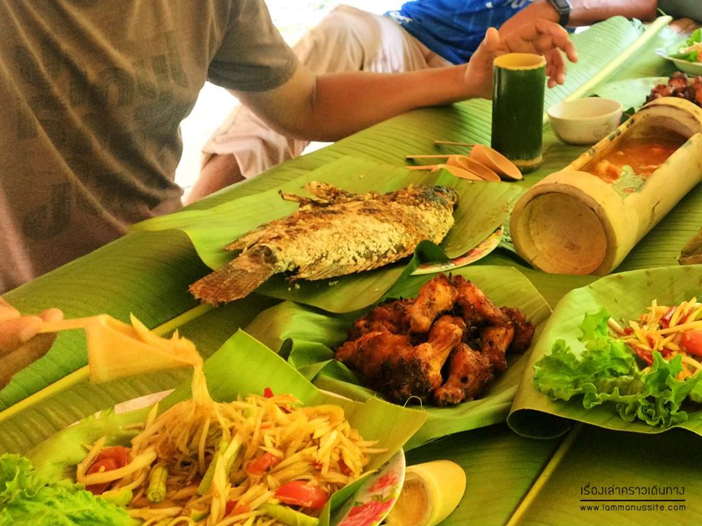 ทีมงานจัดอาหารมาให้เพียงพอกับจำนวนคนที่มา ของเรา 6 คน ได้ปลาเผา 2 ตัว ไก่ย่าง 2 จาน แกงส้ม ส้มตำ 2 จาน แต่สั่งเพิ่มได้ พี่แกวิ่งไปตำให้ เพราะอาหารเขามาทำที่นี่แหละ ที่ดูน่ารักดีคือ ปูโต๊ะด้วยใบตอง อาหารวางมาบนใบตอง แกงใส่กระบอกไม้ไผ่ ข้าวเหนียวก็หุงแบบหลามในกระบอกมา ช้อนยังเป็นไม้ แก้วน้ำก็เป็นกระบอกไม้ไผ่ด้วย กระบอกน้ำกับช้อนไม้เอากลับเป็นที่ระลึกได้ด้วยนะ