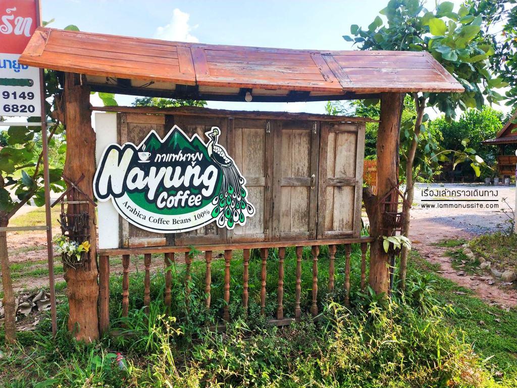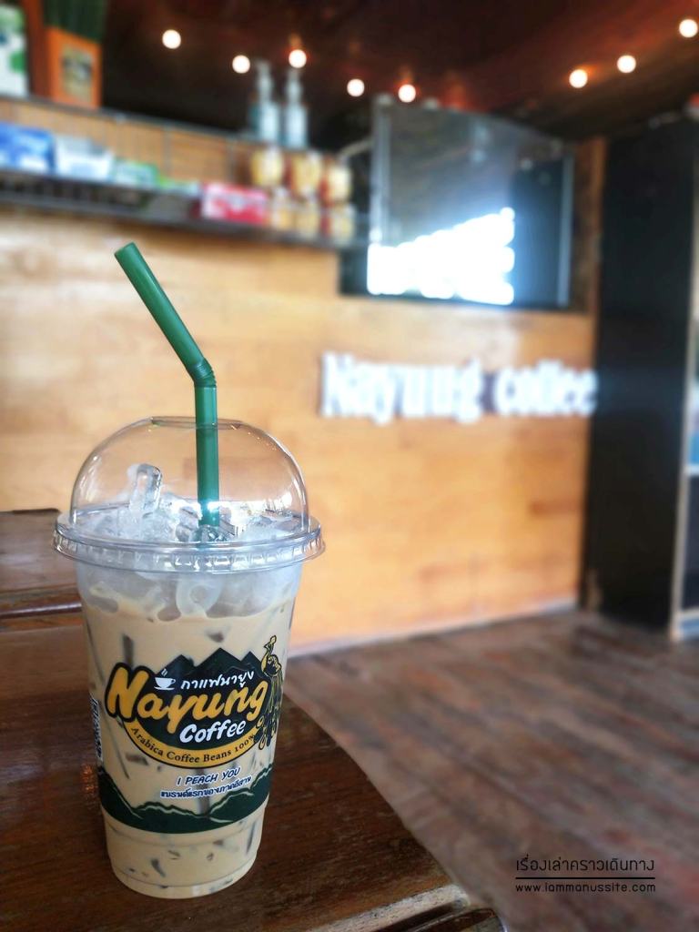 พวกเราแวะจิบกาแฟนายูงที่ร้านทางผ่าน เลือกชิม กาแฟเย็นนายูง รสชาติเข้มข้นได้อยู่ มีติดขมหน่อยๆ เราก็ลืมนึกไปว่า อิสานคือที่ราบสูง มีความสูงอยู่แล้ว ผลผลิตกาแฟอราบิก้าอิสานก็เลยดีไม่แพ้กาแฟอราบิก้าบนดอยทางเหนือนะ