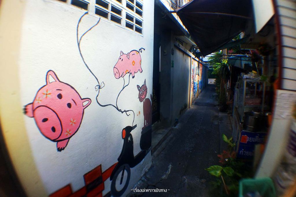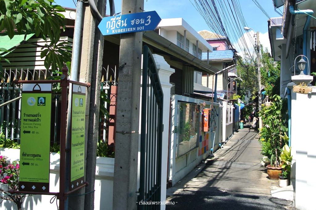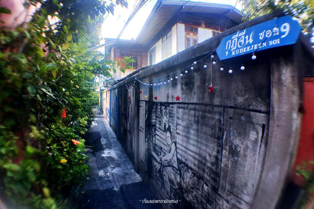จากนี้ก็เดินเข้าไปเที่ยวในชุมชนกุฎีจีกันล่ะ เราเดินไปด้านหลังโบสถ์จะเจอซอยกุฎีจีน 1 วนต่อไปซอย 2 ซอย 3 มาถึงซอย 4 เป็นตรอกเดินเข้าไปได้ มีตรอกซอกซอยเยอะแยะ เลือกเดินกันตามสะดวก มีเวลามาก ก็เดินวนไปทุกซอกทุกซอย บางซอยก็มีกราฟิตี้ บางซอยก็มีบ้านสวยๆ บางซอยก็มีขายอาหาร ขายยขนม บางซอยก็มีแต่บ้านคน จุดเด่นที่อยู่ในแผนที่เดินเที่ยวจะมีป้ายชีบอกทางอยู่