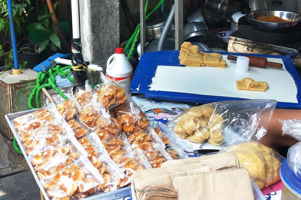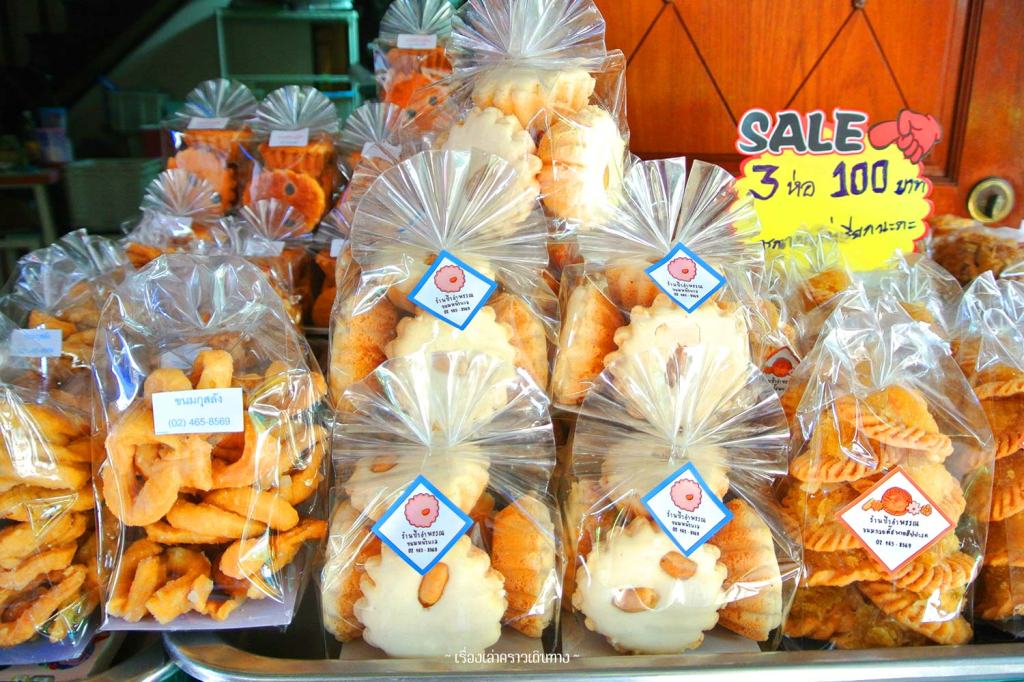 ระหว่างทางเดินแวะซื้อขนมจาก ร้านป้าอำพรรณ (7) เป็นการกระจายรายได้อย่างทั่วถึง ซื้อมา 3 อย่าง 3 ถุง 100 บาท ราคามาตรฐานขนมของฝาก ก๋วยตั๊ส (พายสัปปะรด) ขนมหน้านวล ขนมกุสลา (ร้านบอกว่าไม่ได้มีทุกวัน ทำเฉพาะเทศกาล เราโชคดีที่มีขายวันนี้เพราะทำไว้ในงานของโบสถ์) ส่วนขนมฝรั่งไม่ได้อุดหนุนเพราะจะไปอุดหนุนของร้านธนูสิงห์