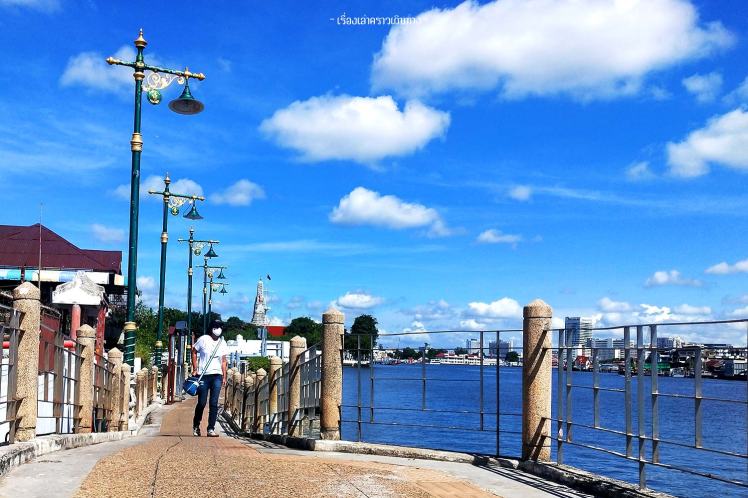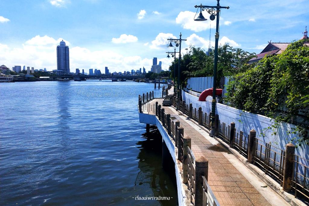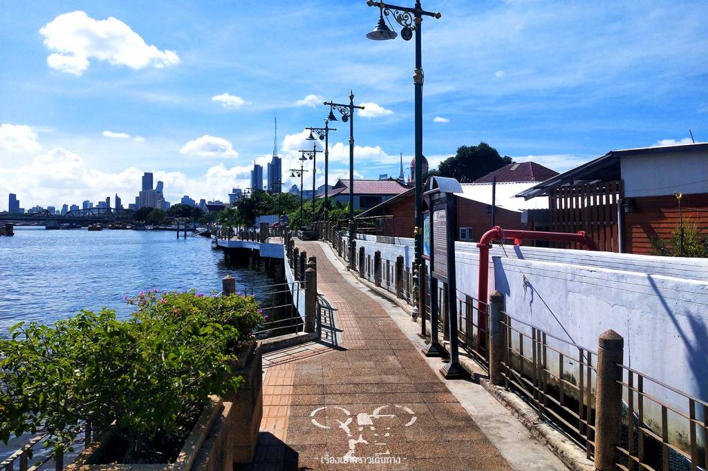 จากวัดกัลยาฯ เดินออกไปที่ท่าเรือ จะเห็นทางเดินเลียบริมแม่น้ำเจ้าพระยา เป็นทางปูนอย่างดี มีสัญลักษณ์บอกแนวให้นักปั่นได้ปั่นเที่ยวด้วย มาปั่นช่วงเช้าหรือช่วงเย็นน่าจะบรรยากาศดี เดินเลียบแม่น้ำมาไม่กี่เมตร ก็เจอศาลเจ้าเกียนอันเกง