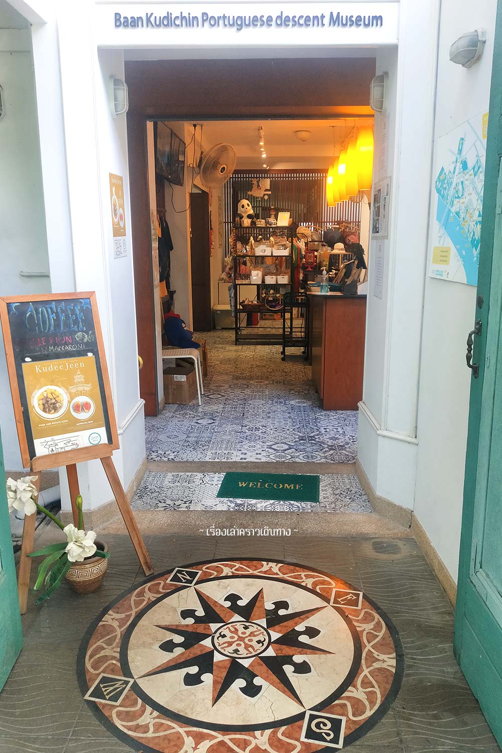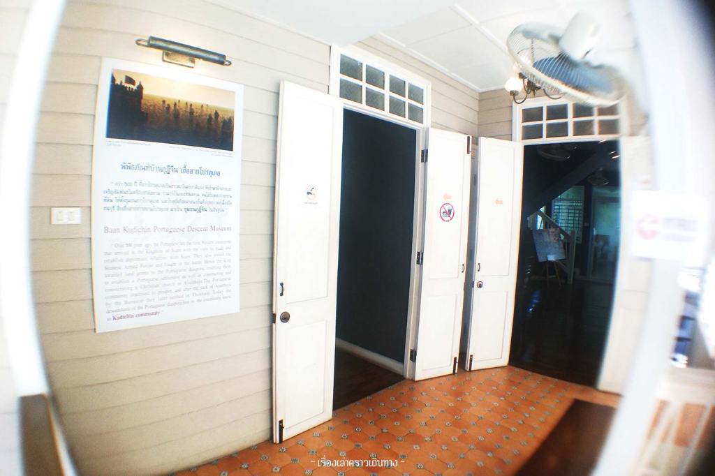 เดินตรงๆตามตรอกซอย 3 จะมาเจอ พิพิธภัณฑ์กุฎีจีน เข้าฟรีนะ เป็นคนในชุมชนที่ต้องการทำพิพิธภัณฑ์เพื่อบอกเล่าประวัติของย่านกุฎีจีน และเพื่อบันทึกเรื่องราวความเป็นมาของชาวสยาม-โปรตุกิส แนะนำเลยว่าควรเข้าไปชม ตัวพิพิธภัณฑ์เป็นบ้านเก่าที่บูรณะแล้วมาเปิดให้เข้าชม มี 3 ชั้น ชั้นล่างเป็นคาเฟ่ และร้านขายของที่ระลึก กรุณาอุดหนุนด้วยนะ เพราะเขาเปิดให้เข้าชมฟรี ขึ้นไปชั้นที่ 2 จัดเป็นห้องแสดงเรื่องราวความเป็นมาของชาวโปรตุเกสในประเทศไทย และที่มาของชาวไทยเชื้อสายโปรตุเกส ขึ้นไปชั้น 3 จะจำลองห้องนอนสมัยก่อน มีเตียงมีโต๊ะจัดแสดง อันที่เห็นแล้วมันใช่เลยคือผ้าม่าน เป็นแบบที่จำได้ว่าเคยเห็นตอนเด็กๆที่บ้านคุณชวดเลย ลมพัดผ้าม่านปลิวไสว สุดท้ายขึ้นไปดาดฟ้า เป็นจุดชมวิวชุมชนกุฎีจีนได้ทั่ว ด้านซ้ายมองเห็นวัดกัลยาฯ เห็นศาลเจ้า ไล่มาถึงทางขวามือคือโบสถ์ซางตาครูส มองลงไปที่ชุมชนเห็นแต่หลังคาแน่นไปหมด