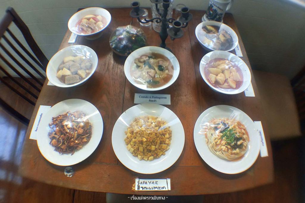ในพิพิธภัณฑ์ชั้น 3 ที่โต๊ะอาหาร วางอาหารโปรตุเกสให้ดู มื้อเที่ยงก็เลยต้องไปหาชิมอาหารโบราณสักหน่อย ฝั่งเยื้องๆกับพิพิธภัณฑ์ มีร้านอาหารสกุลทอง ดูน่าสนใจมาก แต่เราไม่ได้กินข้าวร้านนี้ เพราะมาคนเดียวอยากกินหลายอย่าง กินไม่ไหว เลยเดินย้อนไปที่โบสถ์ ตรงติดกับท่าน้ำ มีร้านอาหารเล็กๆแอบอยู่