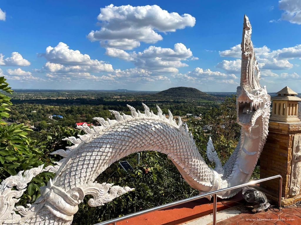 จากสะพานเทพสุดามาแค่ 6 กม. จะเห็นพระพุทธรูปปางมารวิชัยสีขาวขนาดใหญ่อยู่บนยอดภูสิงห์ การจะขึ้นไปพุทธสถานภูสิงห์ เลือกได้ว่าจะเดินขึ้นบันได 400 ขั้น หรือจะขับรถขึ้น ทางขึ้นเขาเป็นทางแคบชันต้องรอเจ้าหน้าที่ให้สัญญานขับขึ้นหรือลงเป็นรอบ เพราะสวนกันไม่ได้ คนไม่มีรถมาก็มีรถคิวพานั่งขึ้น-ลงด้วย