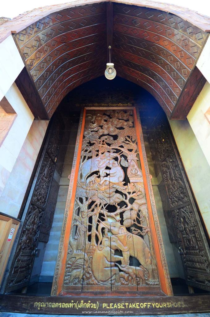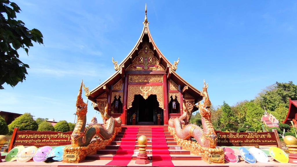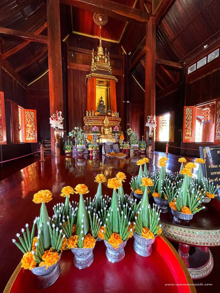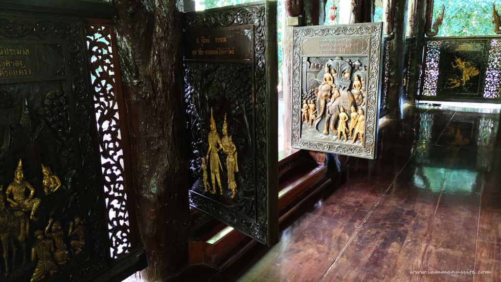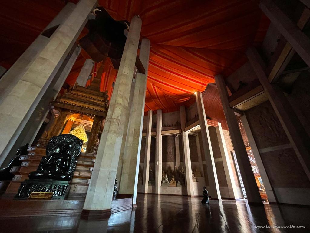จากยอดภูสิงห์ ขับรถมาที่ภูค่าว เลี้ยวเข้าไปในเขตวัดพุทธนิมิตภูค่าว มีลานจอดรถด้านซ้าย จอดแล้วเดินไปจุดแรกที่ “พระอุโบสถไม้” เป็นพระอุโบสถหลังคาจั่วซ้อน 3 ชั้น สร้างจากไม้ใต้เขื่อนลำปาว ไม้แต่ละแผ่นใหญ่มาก แกะสลักสวยงาม แค่เดินดูไม้แกะสลักก็ประทับใจแล้ว เข้าไปกราบ”พระมงคลชัยสิทธิ์โรจนฤทธิประสิทธิพร” พระประธานในอุโบสถ ผนังด้านในก็ยังมีไม้แกะสลักนูนต่ำสวยๆอีกเพียบ