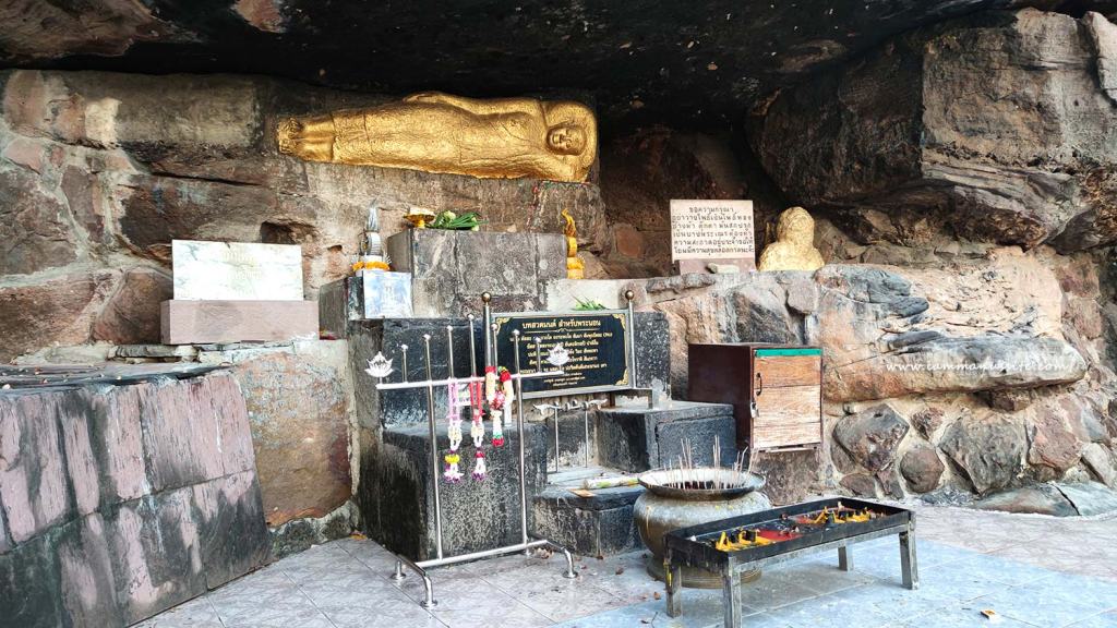 จากบริเวณพระอุโบสถไม้กับพระมหาธาตุเจดีย์ เลยเข้าไปในเขตพื้นที่สงฆ์ด้านใน จะเดินผ่านป่าไปก็ได้ หรือขับรถไปตามถนนก็ได้ ระยะทางประมาณ 300 ม. จอดรถแล้วเดินไปที่ริมผาเพื่อกราบ “พระพุทธไสยาสน์ภูค่าว” พระนอนความยาว 2 เมตร แกะสลักบนแผ่นผา มีอายุสองพันกว่าปี คือสร้างขึ้นราวปี พ.ศ. 8 เล่ากันว่าผู้ที่แกะสลักพระนอนริมผานี้คือกลุ่มคนที่จะเดินทางไปร่วมสร้างพระธาตุพนม แต่ไปไม่ทัน พระธาตุพนมสร้างเสร็จก่อน ก็เลยร่วมกันสร้างพระนอนตรงนี้ขึ้นแทน ลักษณะของพระนอนก็ไม่เหมือนพระนอนทั่วไป เพราะเป็นพระนอนตะแคงซ้ายโดยนอนราบหนุนแขนซ้าย ไม่ได้นอนหนุนแขนที่ตั้งขึ้นเหมือนพระนอนทั่วไป