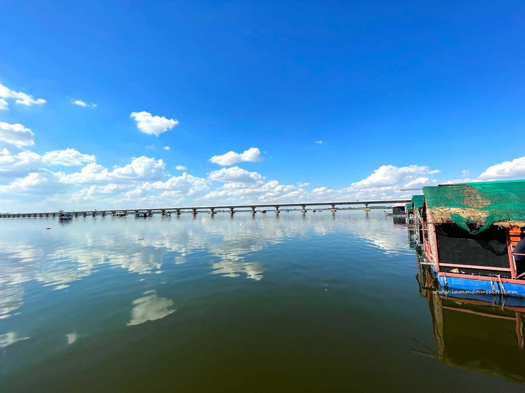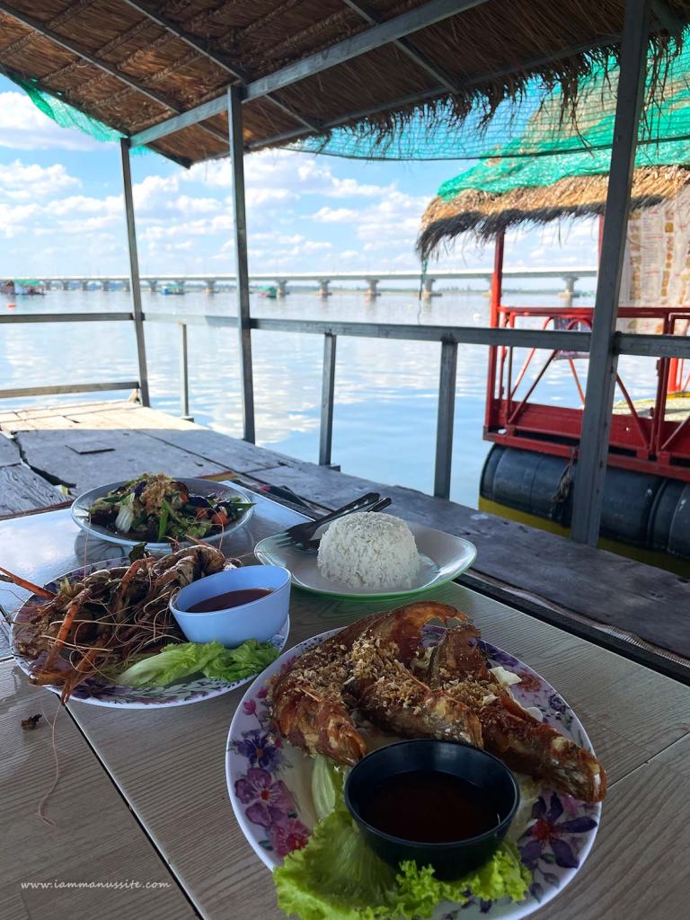 ริมเขื่อนจะมีแพอาหารหลายแพ ก่อนขึ้นสะพานให้ชิดซ้ายเลี้ยวไปถนนริมน้ำ เลือกร้านได้ตามชอบ บรรยากาศริมน้ำเห็นสะพานเทพสุดายาวๆแบบนี้ แนะนำว่ามาช่วงพระอาทิตย์ตกน่าจะสวย ถ้ามานั่งช่วงมื้อเย็นกว่าจะอิ่มก็ต้องขับรถกลับไปในอ.เมืองประมาณ 45 นาที